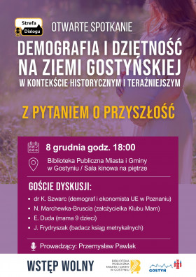 | Miejscowość: Gostyń Miejsce: Biblioteka w Gostyniu Data rozpoczęcia: 08.12.2025 18:00:00 Data zakończenia: 08.12.2025 20:00:00 Organizator: Biblioteka Publiczna Miasta i Gminy w Gostyniu Opis wydarzenia: Takiego tematu jeszcze w Gostyniu nie było. Jest bardzo ważny i dotyczy całego społeczeństwa. Już 8 grudnia o godz. 18.00 w Bibliotece Publicznej Miasta i Gminy w Gostyniu w ramach Strefy Dialogu odbędzie dyskusja panelowa z udziałem publiczności na temat: Demografia ziemi gostyńskiej w kontekście historycznym, współczesnym i z pytaniem o przyszłość? Wśród zaproszonych gości znajdują się dr Krzysztof Szwarc z Uniwersytetu Ekonomicznego w Poznaniu, badacz demografii i płodności. Jacek Frydryszak – badacz ksiąg metrykalnych parafii Stary Gostyń znający tendencje demograficzne w minionych wiekach. Natalia Marchewka-Bruscia – założycielka Klubu Mam działającego w BPMiG w Gostyniu, a także Elżbieta Duda – mama 9 dzieci. W trakcie debaty postaramy się zasygnalizować podstawowe problemy i odpowiedzieć na nurtujące współczesne społeczeństwo pytania. Jak wyglądają tendencje demograficzne w skali świata, Europy, Polski i czy ich odzwierciedleniem jest również sytuacja w naszym regionie? Z czego wynikała duża dzietność w minionych wiekach? Na ile rzetelnie ją mierzymy, jakie mamy wyobrażenia? Co dziś wpływa na demografię – czynniki ekonomiczne, mieszkalnictwo, styl życia, kariera zawodowa, konsumpcjonizm, hedonizm, brak wsparcia społecznego, antykoncepcja, wzorce kulturowe, propaganda ideologiczna, zagrożenia cywilizacyjne, dążenie do perfekcji w ideale wychowawczym i materialnym, zmiana priorytetów w decyzjach ludzkich? Czy ludzie chcą mieć dzieci ale warunki im nie pozwalają, czy też nie chcą mieć dzieci? Zmiana struktury społecznej na skutek poprawy warunków sanitarnych i rozwoju medycyny – wydłużenie życia? Czy będziemy społeczeństwem seniorów i jedynaków? Czy te tendencje można odwrócić? Na ile są trwałe? Jak będzie wyglądać przyszłość? Panel moderować będzie Przemysław Pawlak – dyrektor BPMiG w Gostyniu Przyjdź! Nie bądź obojętny. Zabierz głos w miłej, rzeczowej i kulturalnej atmosferze. |