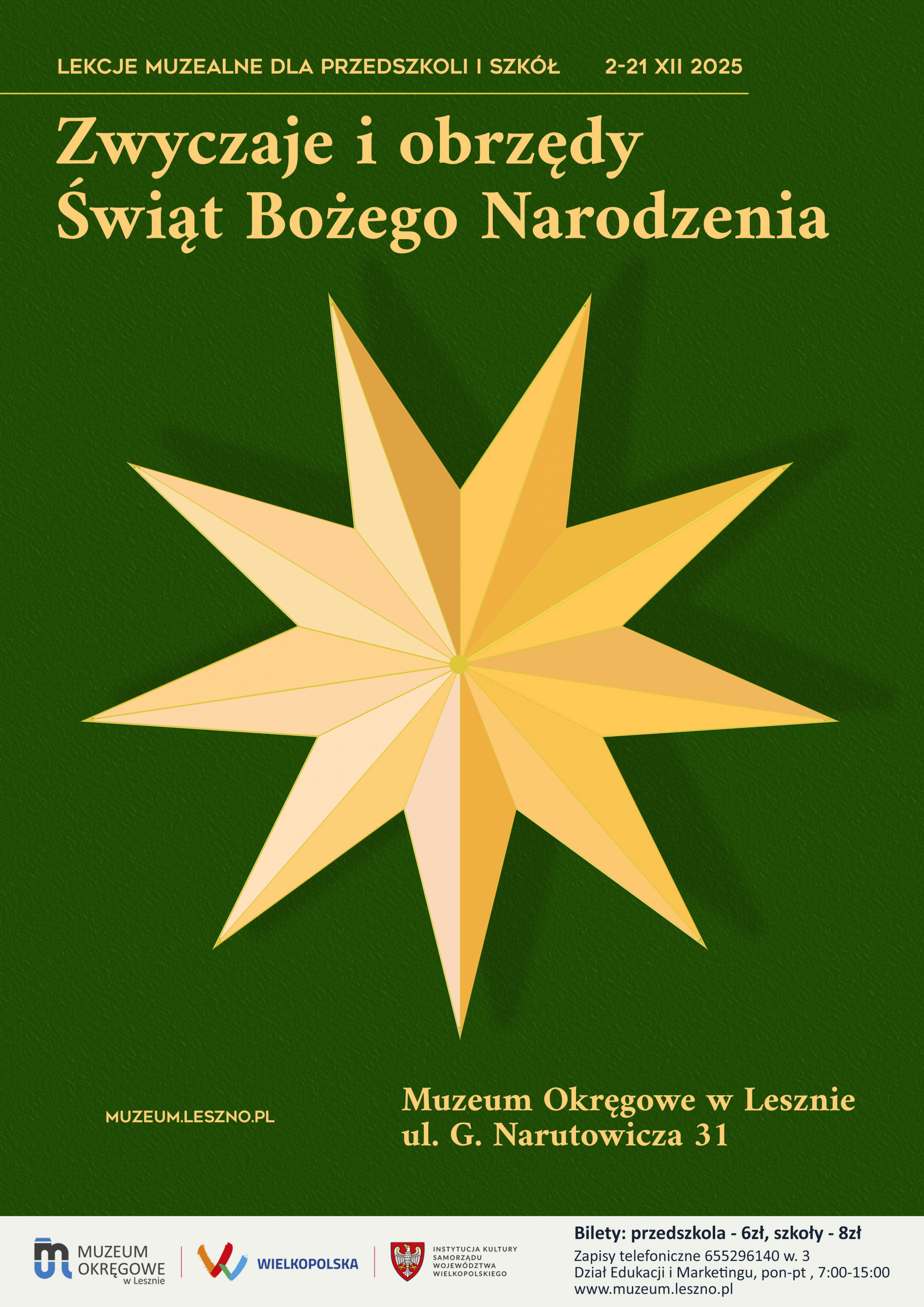 | Miejscowość: Leszno Miejsce: Muzeum Okręgowe w Lesznie, ul. G. Narutowicza 31 Data rozpoczęcia: 03.12.2025 13:00:00 Data zakończenia: 21.12.2025 16:00:00 Organizator: Muzeum Okręgowe w Lesznie Opis wydarzenia: Od 2 grudnia serdecznie zapraszamy grupy zorganizowane na wyjątkowe lekcje muzealne pt. „Zwyczaje i obrzędy Świąt Bożego Narodzenia”. To niezwykła okazja, aby poczuć magię świąt i poznać bogactwo tradycji, które od pokoleń towarzyszą Bożemu Narodzeniu. W świątecznej atmosferze – w otoczeniu pachnącej choinki i wyjątkowej szopki bożonarodzeniowej – uczestnicy wysłuchają opowieści o dawnych zwyczajach i wierzeniach związanych z tym szczególnym czasem. Dowiedzą się m.in.: - jak wyglądały przygotowania do wieczerzy wigilijnej, - skąd wziął się zwyczaj przynoszenia do domu zielonego drzewka, - jakie znaczenie miała „magiczna noc” oraz towarzyszące jej rytuały. Każdy uczestnik wykona również własną dekorację świąteczną, którą zabierze ze sobą do domu. Akcja trwa do 21 grudnia 2025.Zasady uczestnictwa w lekcjach muzealnych dostępne są na www.muzeum.leszno.pl Kontakt Zgłoszenia na lekcje muzealne oraz informacji na ich temat udziela Dział Edukacji i Marketingu Muzeum pod numerem telefonu: 65 529 61 40, w. 3 od poniedziałku – piątku w godzinach od 7.00 – 15.00; edukacja@muzeum.leszno.pl |