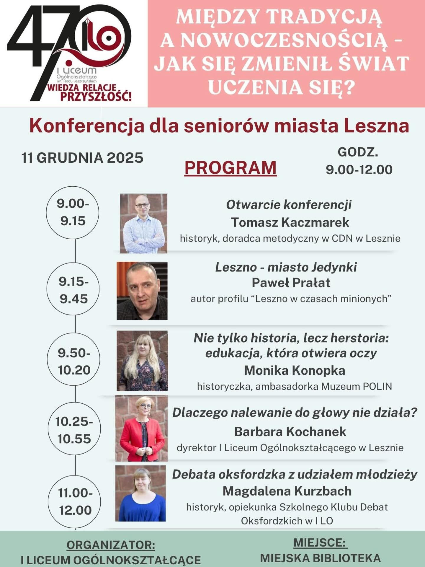 | Miejscowość: Leszno Miejsce: Miejska Biblioteka Publiczna Data rozpoczęcia: 11.12.2025 09:00:00 Data zakończenia: 11.12.2025 12:00:00 Organizator: I Liceum Ogólnokształcące w Lesznie Opis wydarzenia: Z okazji 470-lecia I LO zaprasza do swojego świata! Już 11 grudnia (godz. 9-12) w Miejskiej Bibliotece Publicznej odbędzie się konferencja pod nazwą „Między tradycją a nowoczesnością – jak się zmienił świat uczenia się?” Swoje zaproszenie kierujemy do seniorów miasta Leszna, którzy chcieliby poznać jak od środka wygląda współczesna szkoła. |
