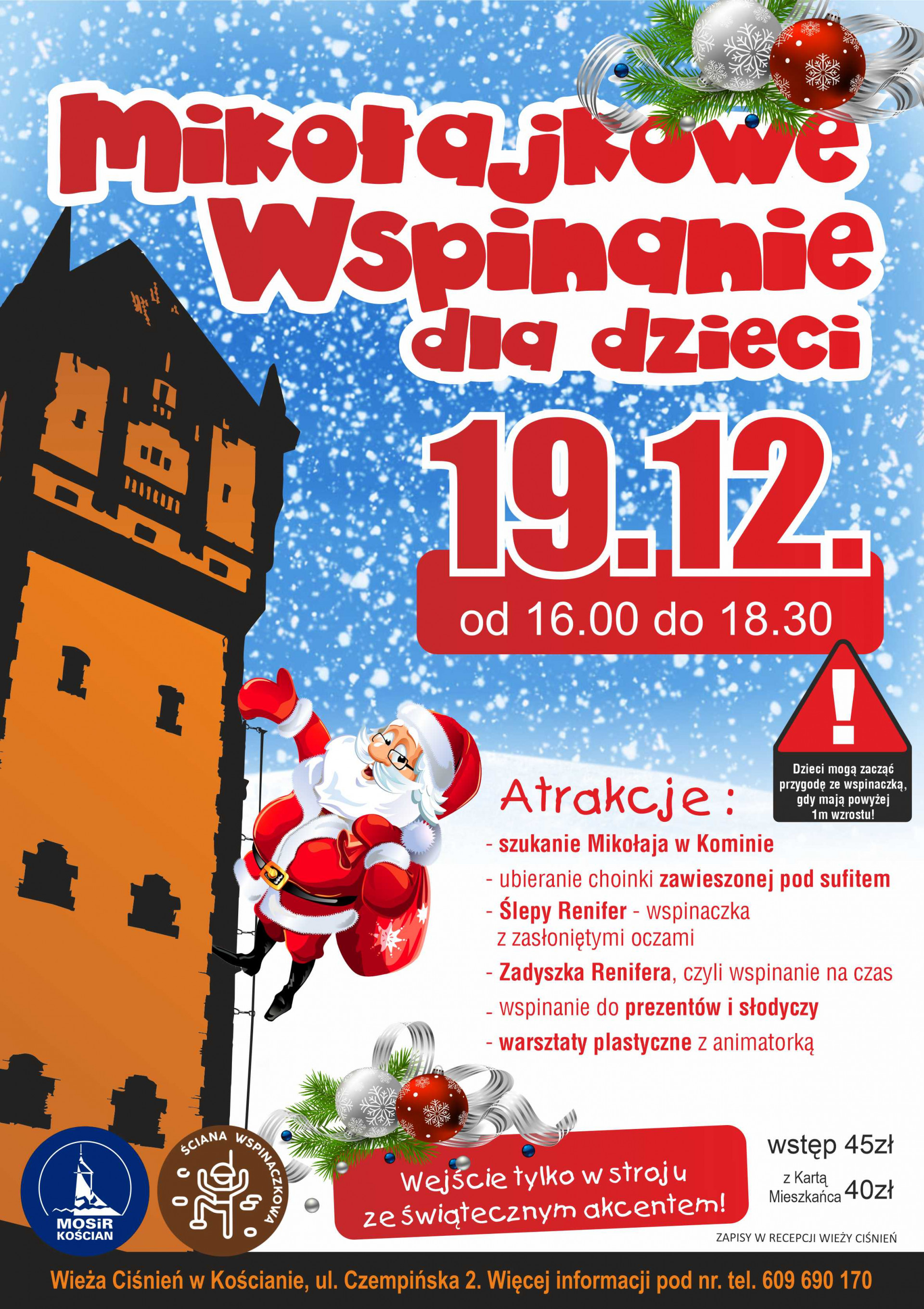| Miejscowość: Kościan Miejsce: Wieża Ciśnień, ul. Czempińska 2 Data rozpoczęcia: 19.12.2025 16:00:00 Data zakończenia: 19.12.2025 18:30:00 Organizator: Wieża Ciśnień Kościan Opis wydarzenia: Zapraszamy na Mikołajkowe Wspinanie dla Dzieci, które odbędzie się 19 grudnia w godzinach 16:00 - 18:30. Podczas imprezy na dzieci czekać będą takie atrakcje jak: – szukanie Mikołaja w Kominie – ubieranie choinki zawieszonej pod sufitem – Ślepy Renifer – wspinaczka z zasłoniętymi oczami – Zadyszka Renifera – wspinanie na czas – Wspinanie do prezentów i słodyczy – Warsztaty plastyczne z animatorką Wejście w stroju ze świątecznym akcentem. Impreza przeznaczona jest dla dzieci o wzroście powyżej 1 metra. Zapisy w recepcji Wieży Ciśnień lub pod numerem 609-690-170. Ilość miejsc ograniczona. Cena 45zł/40 z Kościańską Kartą Mieszkańca. Więcej informacji pod numerem 609-690-170. Serdecznie zapraszamy. |