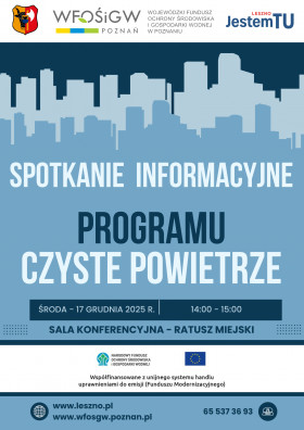 | Miejscowość: Leszno Miejsce: Ratusz Miejski Data rozpoczęcia: 17.12.2025 14:00:00 Data zakończenia: 17.12.2025 15:00:00 Organizator: Urząd Miasta Leszna, Wydział Ochrony Środowiska Opis wydarzenia: Serdecznie zapraszamy do udziału w bezpłatnym spotkaniu informacyjnym dotyczącym Programu „Czyste Powietrze”. Odbędzie się ono 17 grudnia o godzinie 14:00 w Sali Konferencyjnej w Ratuszu Miejskim. Podczas spotkania omówione zostaną: • Program Czyste Powietrze: o aktualne zasady, poziomy wsparcia i wymagania programu, o możliwości uzyskania wsparcia na termomodernizację budynków, o praktyczne wskazówki dotyczące składania wniosków. • Pozostałe dostępne formy dofinansowań do wymiany źródeł ciepła (dotacja miejska, ulga termodernizacyjna). Spotkanie poprowadzą pracownicy punktu konsultacyjno-informacyjnego Programu Czyste Powietrze działającego przy Wydziale Ochrony Środowiska Urzędu Miasta Leszna, którzy odpowiedzą również na Państwa pytania i wątpliwości. Zapraszamy wszystkich zainteresowanych mieszkańców – to doskonała okazja, aby poznać korzyści płynące z programu oraz dowiedzieć się, jak skutecznie uzyskać dofinansowanie. |