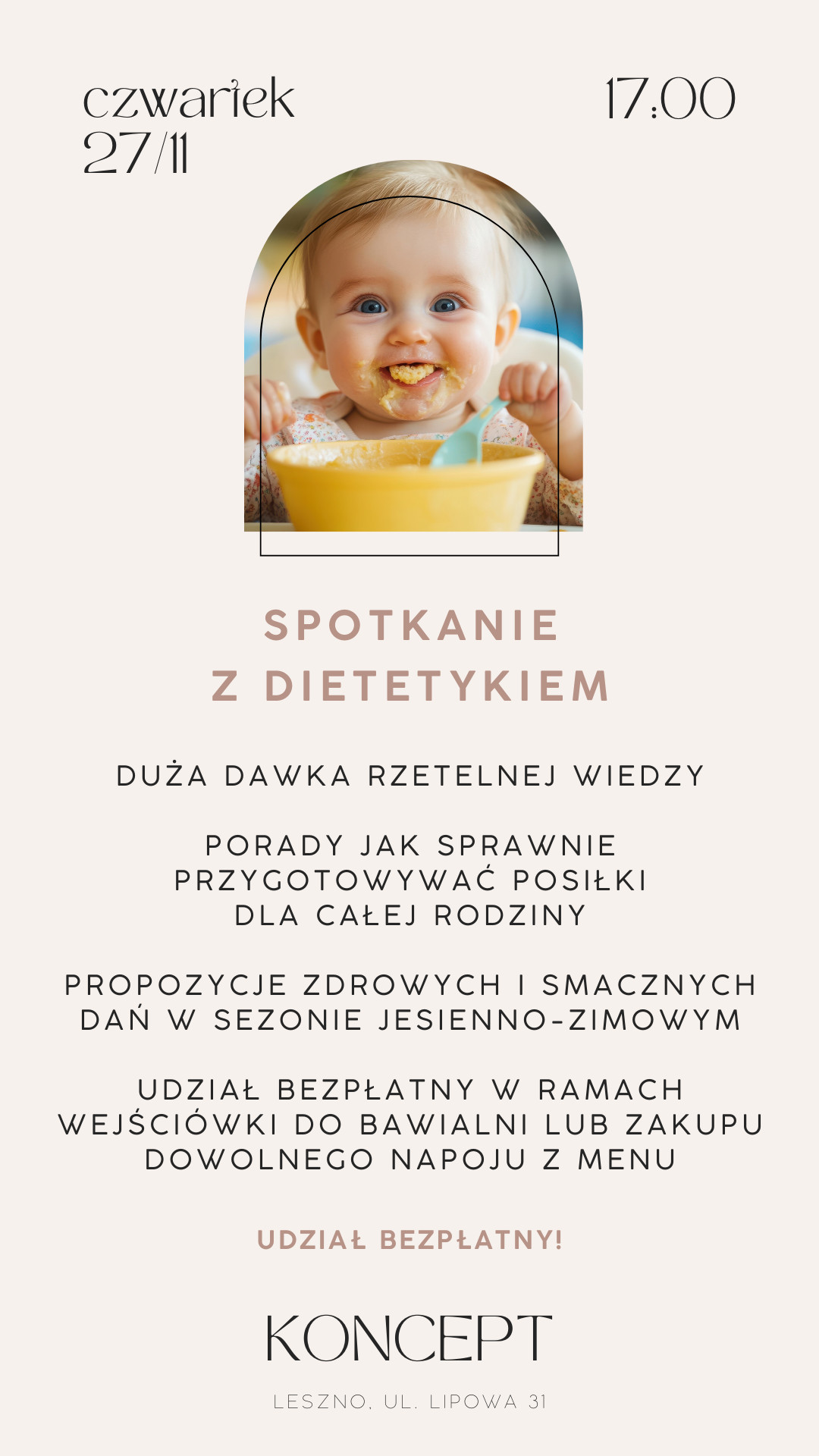 | Miejscowość: Leszno Miejsce: kawiarnia & bawialnia KONCEPT (Leszno, ul. Lipowa 31) Data rozpoczęcia: 17.12.2025 17:00:00 Data zakończenia: 17.12.2025 18:00:00 Organizator: kawiarnia & bawialnia KONCEPT Opis wydarzenia: Sezon jesienno-zimowy przynosi wiele wyzwań nam rodzicom między innymi w zakresie przygotowywania posiłków - zdrowych, pełnowartościowych i smacznych. Dlatego, w ramach naszych spotkań ze specjalistami zaprosiłyśmy Anię Okoń, dietetyczkę kliniczną, która opowie: - jak łatwo przygotowywać wartościowe posiłki dla całej rodziny z uwzględnieniem dzieci w sezonie jesienno-zimowym, - co zaproponować dzieciom do jedzenia w ramach wigilijnych/świątecznych spotkań, - jakie są najważniejsze zasady związane z odżywianiem małych dzieci. To spotkanie jest dla Ciebie jeśli: - zaczynacie przygodę z rozszerzaniem diety, - przeszliście już przez ten etap i zastanawiacie się co dalej, - nie macie pomysłów na to jak usprawnić przygotowywanie posiłków dla całej rodziny, aby każdy zjadł ze smakiem pełnowartościowe dania, - macie pytania związane z dietą Twojego dziecka, coś budzi wątpliwości lub obawy, - borykacie się z różnymi nietolerancjami, alergiami lub chorobami pokarmowymi. Przyjdź i posłuchaj specjalistki w zakresie odżywiania, a prywatnie mamy, która sama przerobiła różne scenariusze związane z jedzeniem swojego dziecka. Udział w spotkaniu jest BEZPŁATNY. Wystarczy wykupić wejściówkę do bawialni dla dziecka (jeśli przyjdziecie razem), lub dowolny napój dostępny w menu (jeśli przyjedziesz bez dziecka). Aby wziąć w nim udział wystarczy napisać do nas wiadomość na Facebooku lub Instagramie @konceptleszno KONCEPT - kawiarnia & bawialnia Leszno, ul. Lipowa 31 |