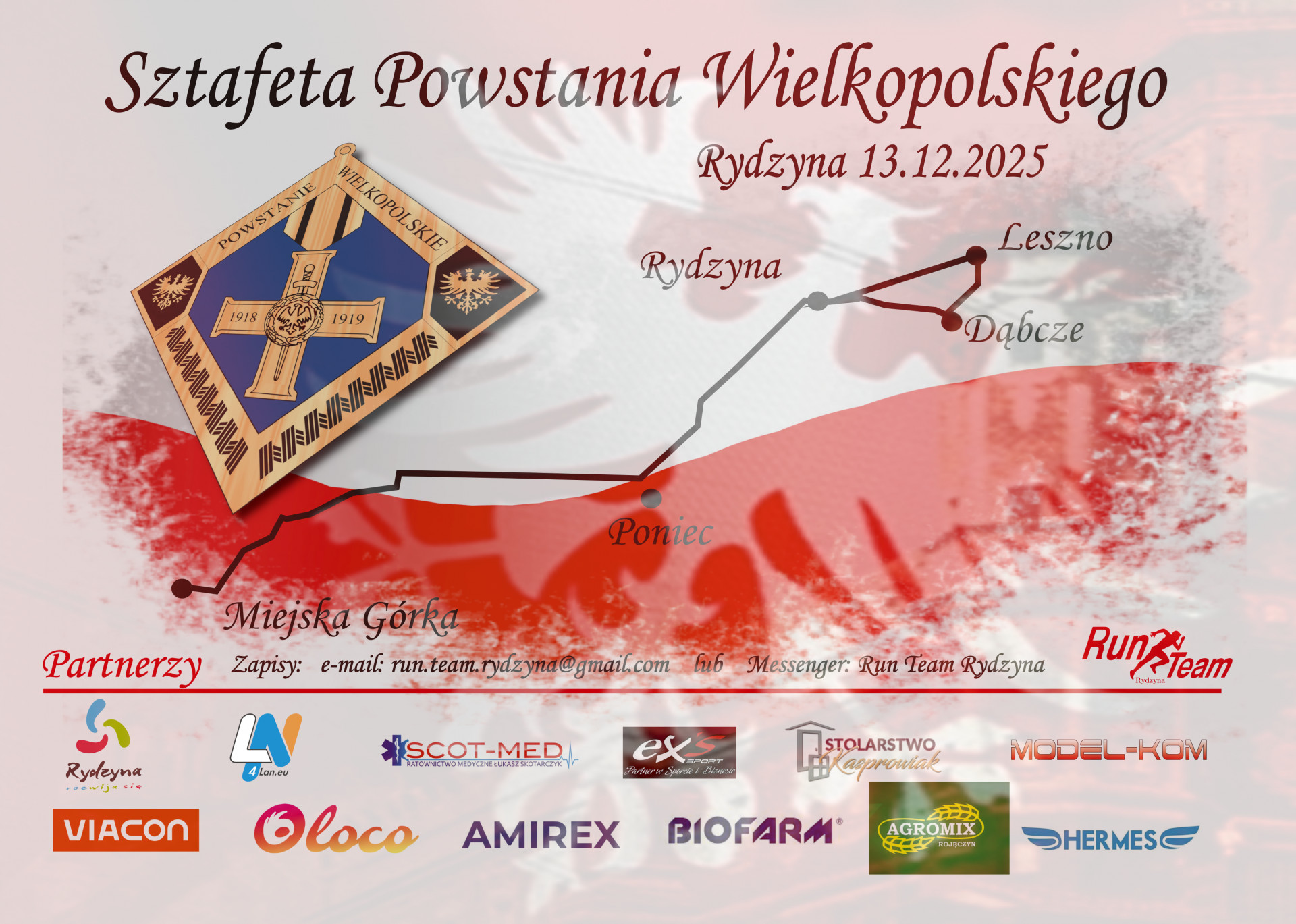 | Miejscowość: Rydzyna Miejsce: Dąbcze Data rozpoczęcia: 13.12.2025 08:30:00 Data zakończenia: 13.12.2025 20:00:00 Organizator: Burmistrz Rydzyny, klub sportowy Run Team Rydzyna Opis wydarzenia: 1.Organizator Burmistrz Rydzyny Run Team Rydzyna 2.Cel Imprezy Upamiętnienie rocznicy Powstania Wielkopolskiego. Popularyzacja aktywności fizycznej i zdrowego stylu życia. Upowszechnianie biegania, jako prostej i ogólnodostępnej formy uprawiania sportu oraz spędzania wolnego czasu. Promocja miasta i gminy. 3.Charakter Imprezy Impreza skierowana jest do osób które w dniu 13 grudnia 2025 chcą uczcić Powstanie Wielkopolskie 4.Termin i miejsce 13 grudnia 2025 godzina 8:30 Start Miejska Górka przy pomniku. Meta na końcu ostatniej pętli Sala Wiejska w Dąbczu 5.Dystans Sztafeta odbędzie się na dystansie 100 km, podzielona na 10 odcinków. Brak limitu czasowego na pokonanie sztafety 100 kilometrów. Przewidywany czas na pokonanie jednego odcinka 10 kilometrów to 1 godzina dopuszczamy dłuższy czas na pokonanie takiego odcinka dla osób które biegają powyżej 6 minut na kilometr lub szybszy niż przewidywany. Każdy z zawodników określa w jakiej grupie na jakim odcinku/odcinkach i na jakim dystansie pobiegnie. 6.Zasady i warunki uczestnictwa Bieg odbędzie się bez względu na pogodę Zawodników obowiązuje strój sportowy Run Team Rydzyna w koszulkach lub bluzach klubowych Do startu w biegu dopuszczeni zostaną zawodnicy, którzy podpiszą oświadczenie o stanie zdrowia, zgodę wizerunkową, zgodę na przetwarzanie danych osobowych i starcie na własną odpowiedzialność. Brak klasyfikacji w OPEN i kategoriach wiekowych ( NIE MA RYWALIZACJI CZASOWEJ ) Na każdym odcinku/odcinkach zadeklarowane osoby BIEGNĄ RAZEM W GRUPIE Limit uczestników 1000 osób Zalecane aby na pętle w godzinach popołudniowych i wieczornych zabrać ze sobą CZOŁÓWKI lub inne źródło światła. 7.Zapisy run.team.rydzyna@gmail.com lub wiadomość Messenger Run Team Rydzyna 8. Trasa Trasa przebiega drogami o nawierzchni z kostki betonowej oraz o nawierzchni asfaltowej. https://goo.gl/maps/wSBvDRq2XxM2 9.Program zawodów 13 grudnia 2025 ( sobota ) 07:20 zbiórka uczestników pierwszych 34 kilometrów czyli 4 odcinków na rynku w Rydzynie w celu przemieszczenia się busem na start w Miejskiej Górce. 08:30 Start Miejska Górka - Konarzewo 10 km 09:30 Konarzewo - Sowiny 8,6 km 10:30 Sowiny - Pomykowo 10 km 11:45 - Pomykowo - Dąbcze 8 km zmiana sztafety przystanek autobusowy przy stawach 12:45 - pętla - Dąbcze - Rydzyna - Leszno - Dąbcze 11 km zmiana sala Wiejska w Dąbczu 14:00 - pętla - Dąbcze - Rydzyna - Leszno - Dąbcze 11 km zmiana sala Wiejska w Dąbczu 15:15 - pętla - Dąbcze - Rydzyna - Leszno - Dąbcze 11 km zmiana sala Wiejska w Dąbczu 16:30 - pętla - Dąbcze - Rydzyna - Leszno - Dąbcze 11 km zmiana sala Wiejska w Dąbczu 17:45 - pętla - Dąbcze - Rydzyna - Leszno - Dąbcze 11 km zmiana sala Wiejska w Dąbczu 19:00 - pętla - Dąbcze - Rydzyna - Leszno - Dąbcze 11 km Meta na końcu ostatniej pętli sala Wiejska w Dąbczu 20:15 - 20:30 przewidywany czas zakończenia biegu |
