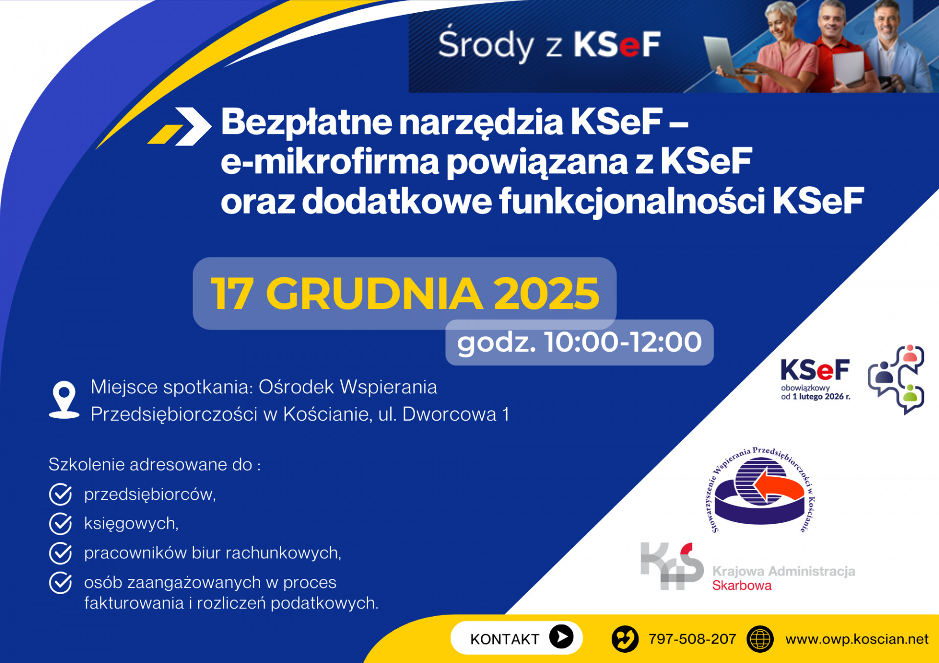 Opis wydarzenia: Naczelnik Urzędu Skarbowego w Kościanie we współpracy ze Stowarzyszeniem Wspierania Przedsiębiorczości w Kościanie zaprasza na cykl szkoleń pt. „Środy z KSeF”, poświęcony Krajowemu Systemowi e-Faktur.