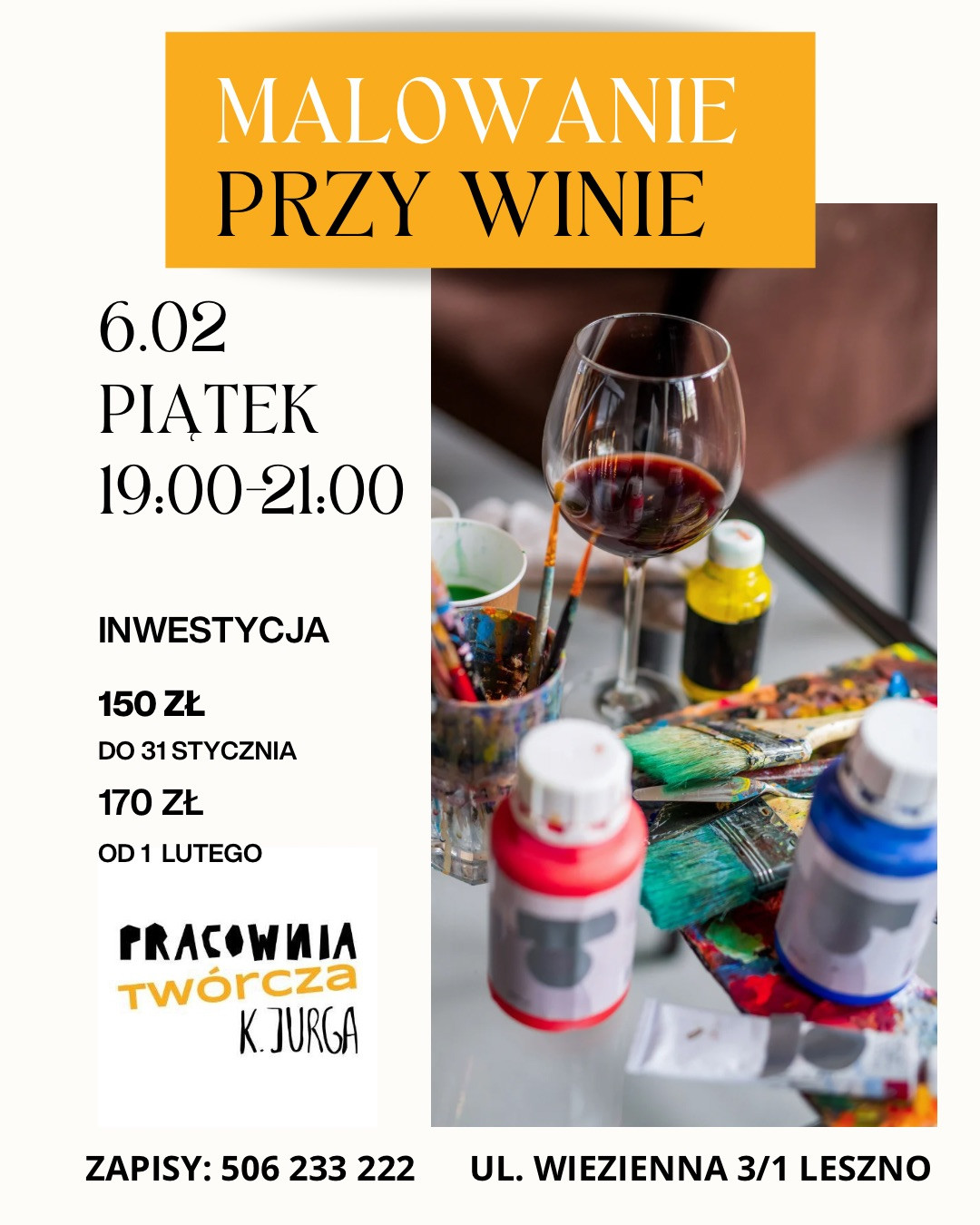 | Miejscowość: Leszno Miejsce: ul. Więzienna 3/1 Data rozpoczęcia: 06.02.2026 19:00:00 Data zakończenia: 06.02.2026 21:00:00 Organizator: Pracownia Twórcza Opis wydarzenia: Wracamy z malowaniem przy winie! |
