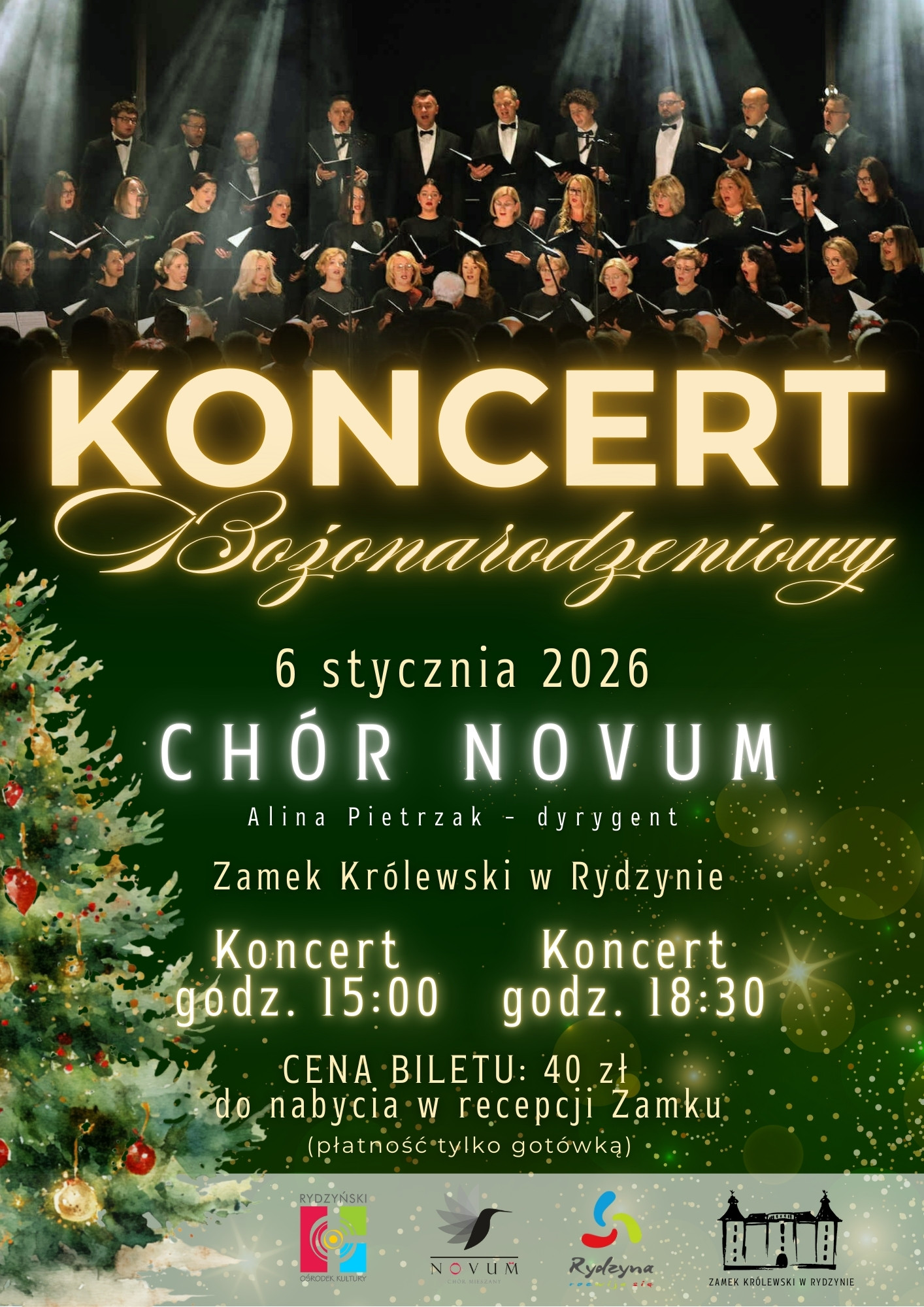 | Miejscowość: Rydzyna Miejsce: Zamek Królewski w Rydzynie Data rozpoczęcia: 06.01.2026 15:00:00 Data zakończenia: 06.01.2026 16:30:00 Organizator: Stowarzyszenie "Chór Novum" Opis wydarzenia: KONCERT BOŻONARODZENIOWY Serdecznie zapraszamy na wyjątkowy wieczór pełen pięknych dźwięków kolęd oraz muzyki bożonarodzeniowej. 6 stycznia 2026 r. Zamek Królewski w Rydzynie. DWA KONCERTY! godz. 15:00 godz. 18:30 Cena biletu: 40 zł. Bilety do nabycia w recepcji Zamku (płatność wyłącznie gotówką). Doskonała okazja, by przedłużyć atmosferę Bożego Narodzenia i wspólnie przeżyć niezapomniany muzyczny wieczór. Serdecznie zapraszamy! |
