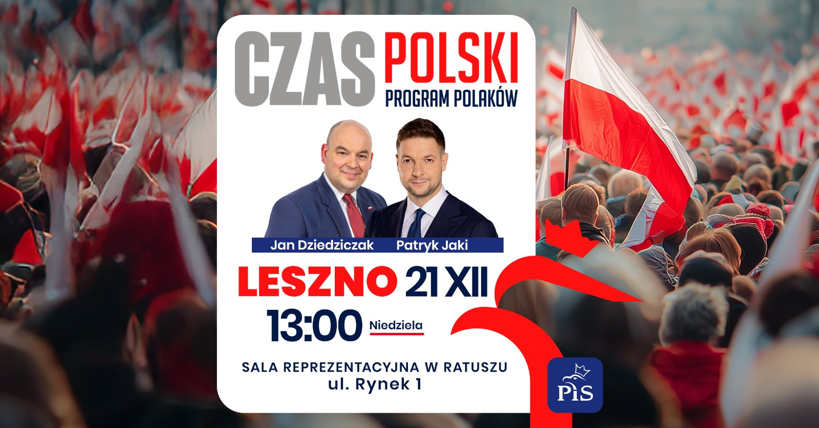 | Miejscowość: Leszno Miejsce: Ratusz, Rynek 1 Data rozpoczęcia: 21.12.2025 13:00:00 Data zakończenia: 21.12.2025 15:00:00 Organizator: Poseł Jan Dziedziczak Opis wydarzenia: Zapraszamy na spotkanie z europosłem Patrykiem Jakim 21 stycznia, niedziela godz. 13:00 w leszczyńskim ratuszu. Szczegóły na stronie biura posła Jana Dziedziczaka www.dziedziczak.pl zapraszamy |
