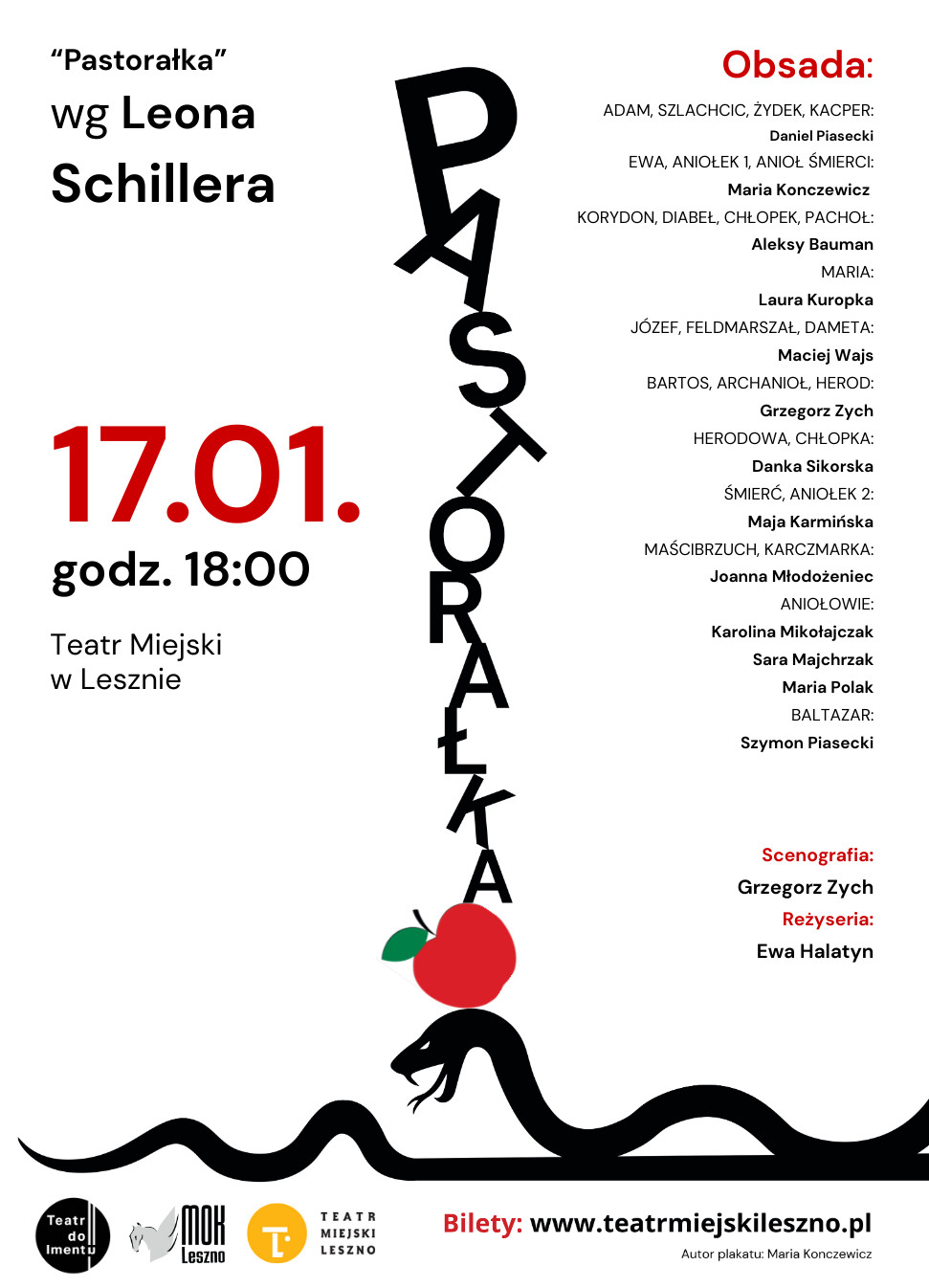 | Miejscowość: Leszno Miejsce: Teatr Miejski Leszno Data rozpoczęcia: 17.01.2026 18:00:00 Data zakończenia: 17.01.2026 19:30:00 Organizator: Teatr do Imentu - Miejski Ośrodek Kultury w Lesznie - Teatr Miejski w Lesznie Opis wydarzenia: Pastorałka - Leona Schillera jest dziełem szczególnym, ponieważ traktuje historię Bożego Narodzenia z małym przymrużeniem oka. Opowieść o Świętej Rodzinie, z udziałem pasterzy, diabłów i aniołów; Trzech Króli, Heroda oraz wielu innych postaci biblijnych, ze swojskim humorem nawiązuje do naszych polskich zalet i przywar. Jest to misterium , które w wyjątkowy sposób wprowadza nastrój zbliżających się Świąt. Groteska, humor i wzruszenie, śpiew i tańce, piękna muzyka z popularnymi kolędami, bogata inscenizacja, przybliża niezwykłymi środkami cud Narodzin w Betlejem. W przedstawieniu aktorzy dają wyjątkowy popis gry, dwojąc się i trojąc w rozmaitych rolach. Trzeba to koniecznie zobaczyć! Sztuka Leona Schillera – reżysera i krytyka teatralnego, uznana za klasyka gatunku, doczekała się wielu realizacji teatralnych, radiowych i telewizyjnych. Teatr Miejskiego Ośrodka Kultury (wcześniej pod nazwą ANAKONDA , Obecnie DO IMENTU), po raz pierwszy spektakl wystawił w grudniu 2010 roku. Reżyseria: Ewa Halatyn Obsada: Maja Karmińska Maria Konczewicz Laura Kuropka Joanna Młodożeniec Danka Sikorska Sara Majchrzak Karolina Mikołajczak Maria Polak Aleksy Bauman Grzegorz Zych Daniel Piasecki Maciej Wajs |