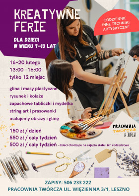 | Miejscowość: Leszno Miejsce: ul. Więzienna 3.1 Data rozpoczęcia: 16.02.2026 13:00:00 Data zakończenia: 20.02.2026 16:00:00 Organizator: Pracownia Twórcza Opis wydarzenia: Zapraszamy na Kreatywne Ferie – kameralne, spokojne i pełne twórczej przygody warsztaty dla dzieci w wieku 7–13 lat. To wyjątkowy czas, w którym dzieci przez aż 3 godziny dziennie mogą zanurzyć się w świecie sztuki, eksperymentować i tworzyć bez pośpiechu. Każdego dnia sięgamy po inne techniki artystyczne – pracujemy z gliną i masami plastycznymi, rysujemy, tworzymy kolaże, robimy zapachowe tabliczki i mydełka, poznajemy string art, prasowanki oraz malujemy obrazy i glinę. Dużo różnorodności, swobody i radości z procesu twórczego. Tworzymy na małą grupę (do 12 dzieci), dzięki czemu panuje ciepła, domowa atmosfera, a każde dziecko ma przestrzeń na własne pomysły i indywidualne wsparcie. To idealna okazja, by kreatywnie spędzić ferie, spróbować nowych rzeczy i po prostu dobrze się bawić w twórczym rytmie. Jeśli jakaś technika nie będzie dziecku odpowiadać, zawsze może wybrać rysowanie lub malowanie. Najważniejsza jest swoboda tworzenia i dobra atmosfera. 16–20 lutego 13:00–16:00 Pracownia Twórcza, ul. Więzienna 3/1, Leszno Zapisy: 506 233 222 150 zł / dzień 550 zł / cały tydzień 500 zł / dzieci chodzące na zajęcia do pracowni i ich rodzeństwo Obowiązuje przedpłata Jeśli szukasz kreatywnych ferii– pełnych sztuki, skupienia i twórczej radości – to będzie piękna przygoda. |
