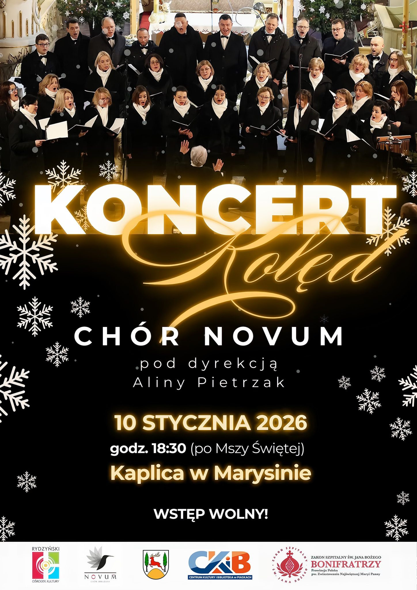 | Miejscowość: MARYSIN, PIASKI 63-820 Miejsce: KAPLICA W MARYSINIE Data rozpoczęcia: 10.01.2026 18:30:00 Data zakończenia: 10.01.2026 19:30:00 Organizator: Centrum Kultury i Biblioteka w Piaskach, Gmina Piaski, Chór NOVUM Opis wydarzenia: Koncert kolędowy Chóru NOVUM w Marysinie Już 10 stycznia o godz. 18:30 w kaplicy w Marysinie wystąpi znany i lubiany Chór Novum Chór powstał w 2017 roku z inicjatywy pasjonatów śpiewu, których łączy miłość do muzyki chóralnej Zespół słynie z różnorodnego repertuaru – od muzyki renesansowej, przez utwory współczesne, aż po piosenki rozrywkowe i ludowe w artystycznych aranżacjach Tym razem chórzyści zaprezentują świąteczny program, w którym usłyszymy najpiękniejsze kolędy – pełne ciepła, wzruszeń i świątecznego nastroju Wstęp wolny Serdecznie zapraszamy wszystkich miłośników dobrego śpiewu i pięknych muzycznych emocji |