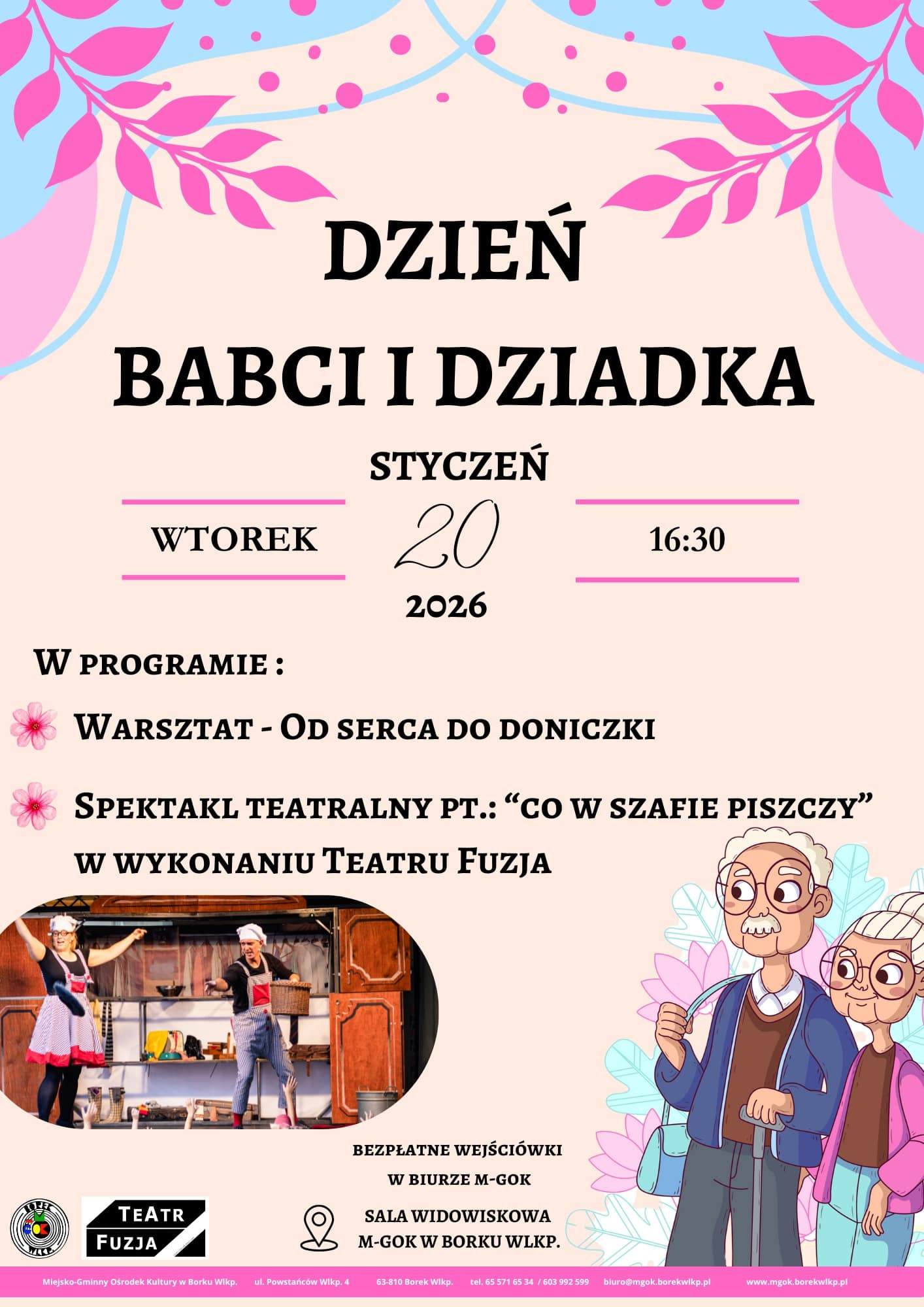 | Miejscowość: Borek Wlkp. Miejsce: Sala widowiskowa M-GOK Borek Wlkp. Data rozpoczęcia: 20.01.2026 16:30:00 Data zakończenia: 20.01.2026 18:00:00 Organizator: Miejsko-Gminny Ośrodek Kultury w Borku Wlkp. Opis wydarzenia: DZIEŃ BABCI I DZIADKA NAJLEPSZY prezent WSPÓLNY CZAS! Zaproś na warsztat i rodzinny spektakl Babcię i Dziadka |