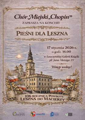 | Miejscowość: Leszno Miejsce: Leszczyńska Galeria Książki pl. Metziga 25 Data rozpoczęcia: 17.01.2026 16:00:00 Data zakończenia: 17.01.2026 17:00:00 Organizator: Chór Miejski "Chopin", Leszczyńska Galeria Książki, Miasto Leszno Opis wydarzenia: Serdecznie zapraszamy na koncert „Pieśni dla Leszna” z okazji 106. rocznicy powrotu Leszna do Macierzy w wykonaniu Chóru Miejskiego „Chopin”. Na wydarzenie zapraszamy w sobotę, 17 stycznia 2026 roku o godz. 16:00 do Leszczyńskiej Galerii Książki (pl. Jana Metziga 25). Wstęp wolny! Chór Miejski „Chopin” to zespół o ponad 100-letniej tradycji, działający od 1920 roku i uświetniający uroczystości państwowe, regionalne oraz wydarzenia artystyczne, pod dyrekcją Bartosza Żołędziejewskiego zaprezentuje pieśni związane z historią i duszą naszego miasta. Chór brał udział w licznych koncertach w całej Polsce i za granicą, a jego działalność została wyróżniona prestiżowymi odznaczeniami, w tym Zasłużony dla Kultury Polskiej oraz Zasłużony dla Miasta Leszna. |
