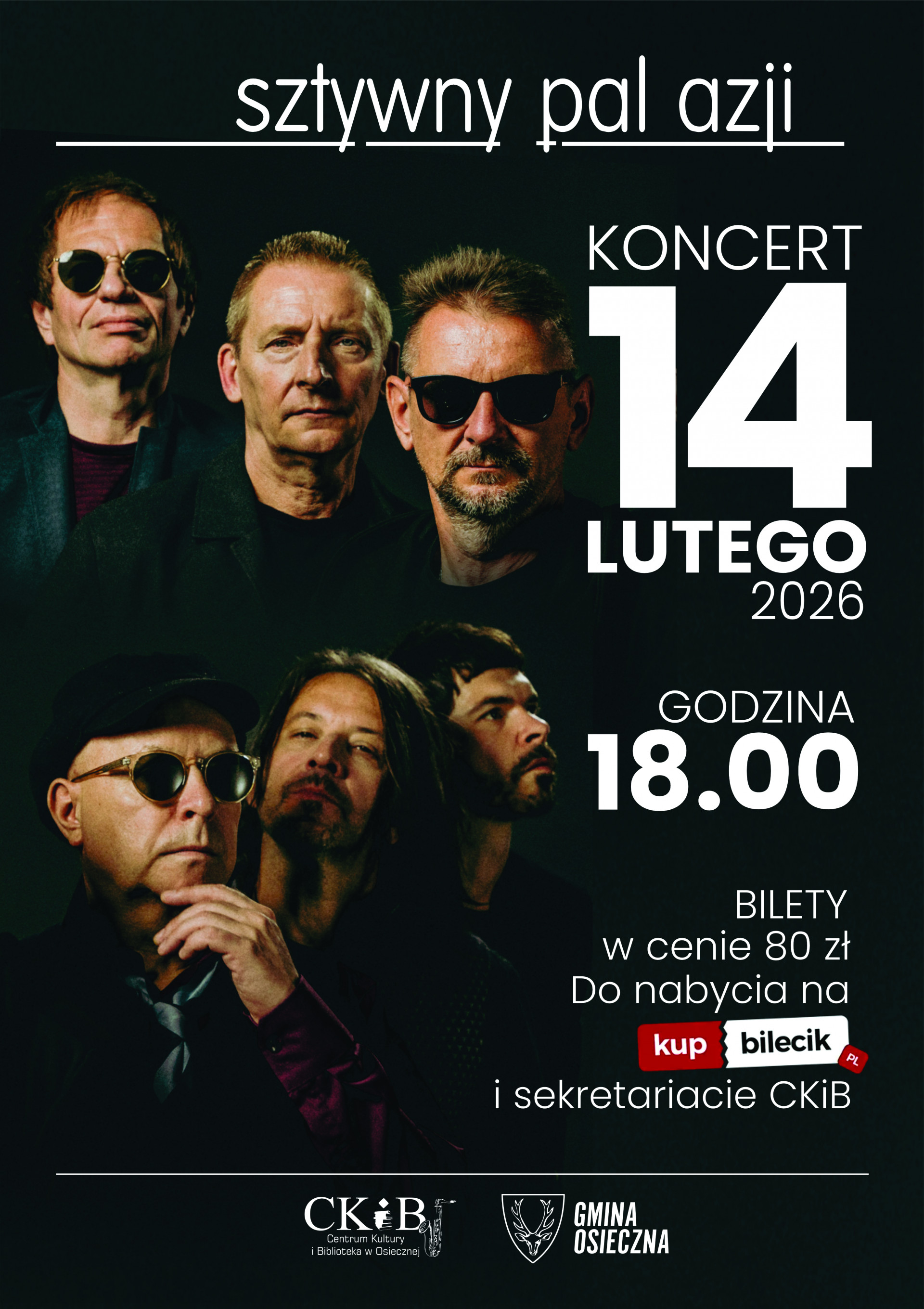 | Miejscowość: Osieczna Miejsce: Centrum Kultury i Biblioteka w Osiecznej Data rozpoczęcia: 14.02.2026 18:00:00 Data zakończenia: 14.02.2026 19:30:00 Organizator: CKiB OSIECZNA Opis wydarzenia: Już 14 lutego 2026 o godzinie 18:00 w Centrum Kultury i Bibliotece w Osiecznej wystąpi legendarny zespół Sztywny Pal Azji! To doskonała okazja, by spędzić walentynkowy wieczór przy świetnej muzyce na żywo. Bilety: 80 zł Dostępne na kupbilecik.pl oraz w sekretariacie CKiB. Nie przegap – szykuje się wyjątkowy koncert! Zapraszamy! |