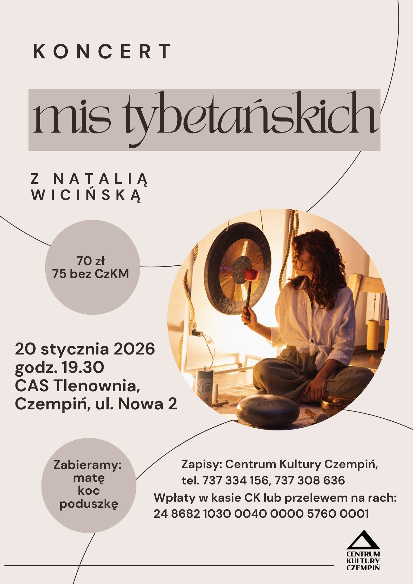 | Miejscowość: Czempiń Miejsce: CAS Tlenownia, Czempiń ul. Nowa 2 Data rozpoczęcia: 20.01.2026 19:30:00 Data zakończenia: 20.01.2026 20:45:00 Organizator: Centrum Kultury Czempiń Opis wydarzenia: Zapraszamy na niezwykłą podróż dźwięków i wibracji! Misy tybetańskie wprowadzą Cię w stan głębokiego relaksu, harmonii i wewnętrznego spokoju. To wyjątkowe doświadczenie, które koi ciało i umysł, pomagając w odprężeniu i regeneracji. Otwórz się na magię dźwięku i zanurz się w świat uzdrawiających wibracji! |