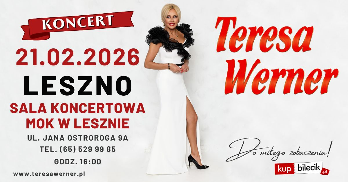 | Miejscowość: Leszno Miejsce: Miejski Ośrodek Kultury Data rozpoczęcia: 21.02.2026 16:00:00 Data zakończenia: 21.02.2026 18:00:00 Organizator: P.P.H.U. ESKA Sp. z o.o. Opis wydarzenia: Koncert Teresy Werner w Lesznie już 21 lutego! Miejski Ośrodek Kultury - Sala Koncertowa MOK przy ul. Jana Ostroroga 9A. Kasa biletowa tel. (65) 529 99 85 lub 667 927 167. Bilety dostępne online: https://www.kupbilecik.pl/imprezy/183033/Leszno/Teresa+Werner/ |
