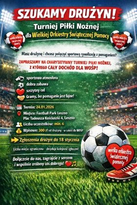 | Miejscowość: Leszno Miejsce: FOOTBALL PARK LESZNO (PLAC TADEUSZA KOŚCIUSZKI 4) Data rozpoczęcia: 24.01.2026 10:00:00 Data zakończenia: 24.01.2026 16:00:00 Organizator: Transformers Leszno Opis wydarzenia: Jak co roku jako studio treningu personalnego TRANSFORMERS organizujemy w szczytnym celu Turniej Piłki Nożnej dla WOŚP. SZUKAMY chętnych drużyn do wzięcia udziału w turnieju! WYMAGANIA: -min. 6 OSÓB W DRUŻYNIE -wpisowe 300 ZŁ OD DRUŻYNY Podczas turnieju zawodnicy jak i kibice będą mogli liczyć na ciepłe napoje oraz poczęstunek. Dla ZWYCIĘSKIEGO ZESPOŁU przewidujemy NAGRODY!!! |