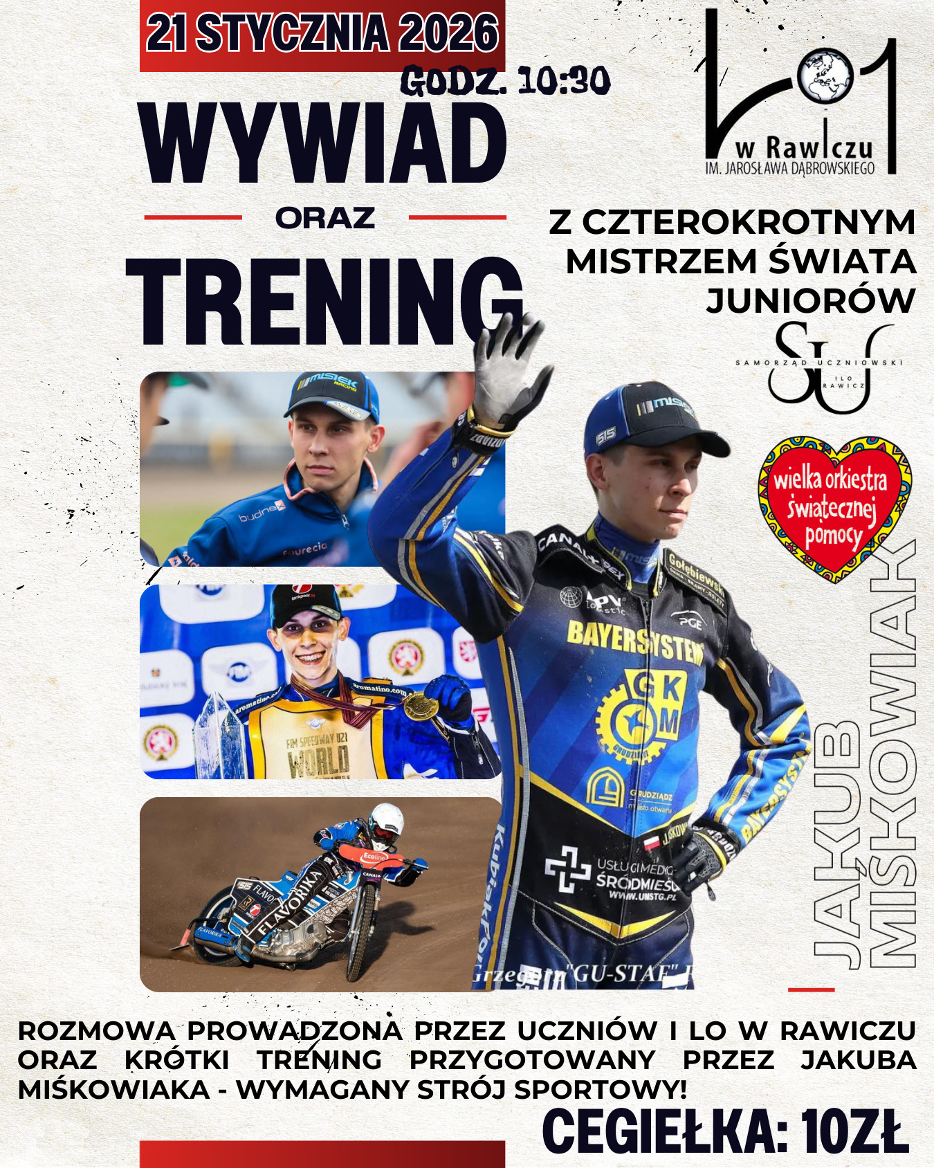 | Miejscowość: Rawicz Miejsce: I Liceum Ogólnokształcące w Rawiczu Data rozpoczęcia: 21.01.2026 10:00:00 Data zakończenia: 21.01.2026 12:00:00 Organizator: SU I LO Rawicz Opis wydarzenia: Wywiad oraz trening poprowadzony przez czterokrotnego mistrza świata juniorów na żużlu, Jakuba Miśkowiaka. Dochód z wydarzenia zasili konto WOŚP. Wydarzenie skierowane do uczniów I LO w Rawiczu. |