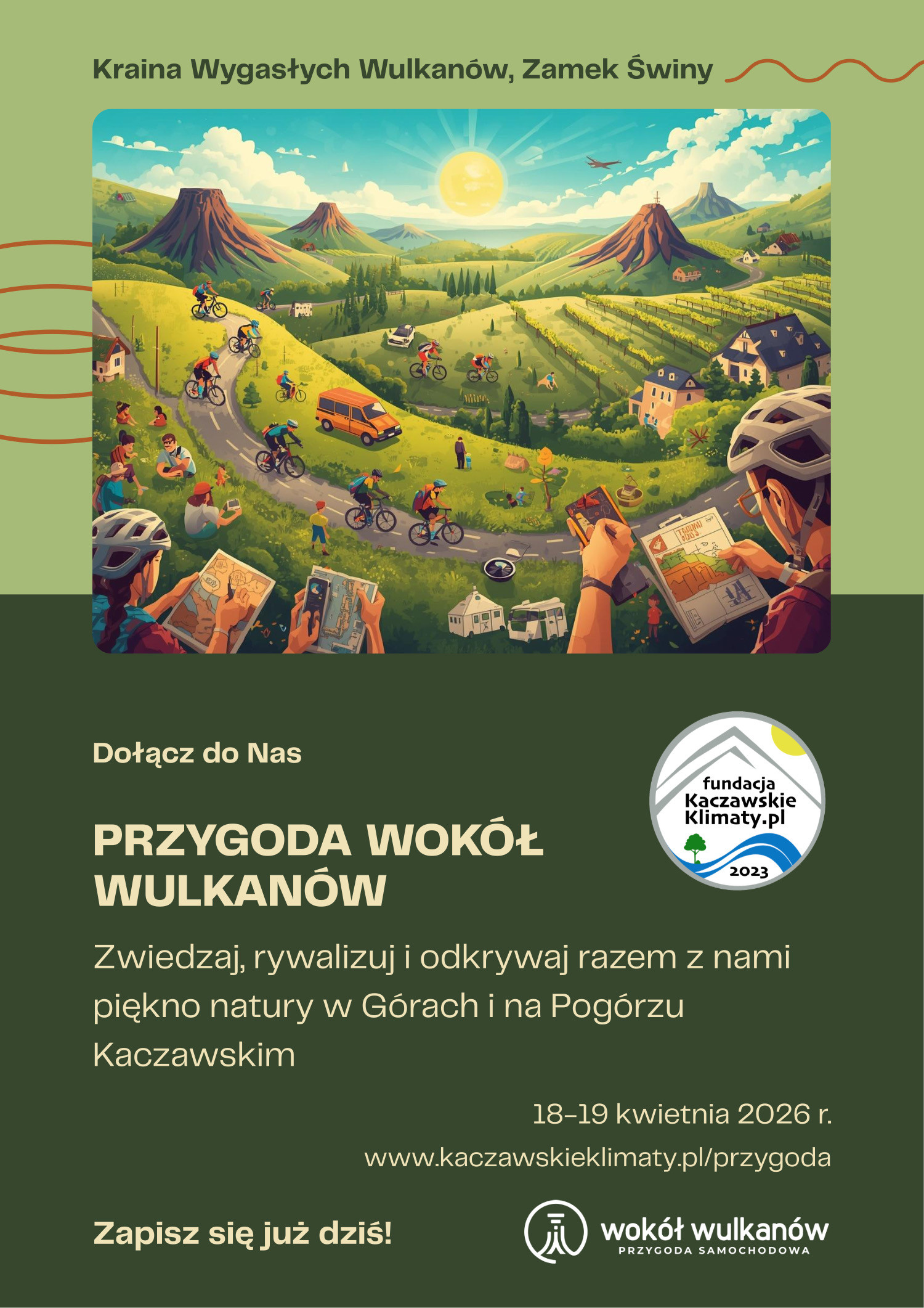 | Miejscowość: Sokołowiec, pow. złotoryjski Miejsce: Winnica Agat Data rozpoczęcia: 18.04.2026 09:00:00 Data zakończenia: 19.04.2026 17:00:00 Organizator: Fundacja KaczawskieKlimaty.pl Opis wydarzenia: Przygoda Samochodowo-Rowerowa Wokół Wulkanów to escape room na świeżym powietrzu. W trakcie dwudniowej zabawy macie do rozwiązania kilkadziesiąt zadań. Przygoda rozpocznie się w kilku różnych lokalizacjach – to Wy zdecydujecie, skąd wystartujecie. Wspólnym punktem finałowym będzie Winnica Agat w Sokołowiec, gdzie odbędzie się meta wydarzenia, Żar Wino oraz After Party. Na realizację wszystkich zadań przewidziany jest czas od 9:00 do 19:00. W pakiecie startowym uczestnicy otrzymają sześć misji, które będzie można wykonywać w spokojnym tempie – bez presji i pośpiechu. Organizatorzy zadbali o to, aby w trakcie gry był czas na obiad, odpoczynek oraz rozmowy z właścicielami odwiedzanych agroturystyk. W trakcie wydarzenia poznacie również zaprzyjaźnione winnice, a także będziecie mieli możliwość zakupu wyjątkowego, „przygodowego” wina. Klimat, zagadki i sama forma zabawy nawiązują do sprawdzonych i cenionych rozwiązań z poprzednich edycji, gwarantując niepowtarzalną atmosferę i niezapomniane wrażenia. W niedzielę uczestnicy odwiedzą Zamek Świny, gdzie czekać będzie specjalnie przygotowany Quest, stanowiący efektowne zwieńczenie całej przygody. To wydarzenie to połączenie gry terenowej, lokalnych smaków, wina i historii – idealna propozycja dla osób szukających aktywnego, a jednocześnie relaksującego weekendu pełnego odkryć. |