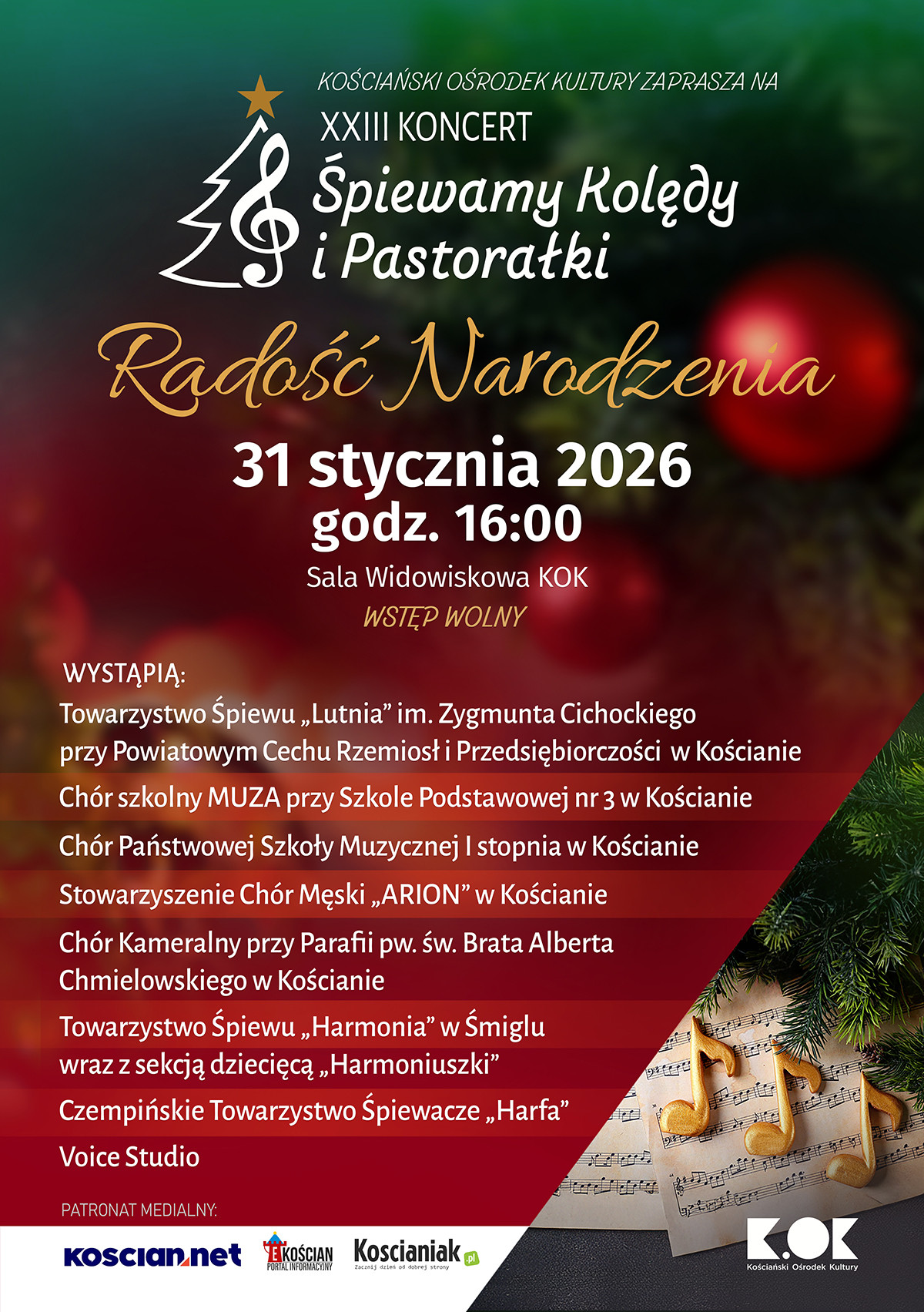 | Miejscowość: Kościan Miejsce: Sala widowiskowa Kościańskiego Ośrodka Kultury Data rozpoczęcia: 31.01.2026 16:00:00 Data zakończenia: 31.01.2026 19:00:00 Organizator: Kościański Ośrodek Kultury Opis wydarzenia: Zapraszamy na XXIII edycję koncertu „Radość Narodzenia”! Już w ostatnią niedzielę stycznia sala widowiskowa KOK wypełni się dźwiękami najpiękniejszych polskich kolęd i pastorałek. Na scenie wystąpią lokalne chóry oraz muzycy z Kościana i okolic, którzy wspólnie z Państwem zwieńczą okres świąteczny. |