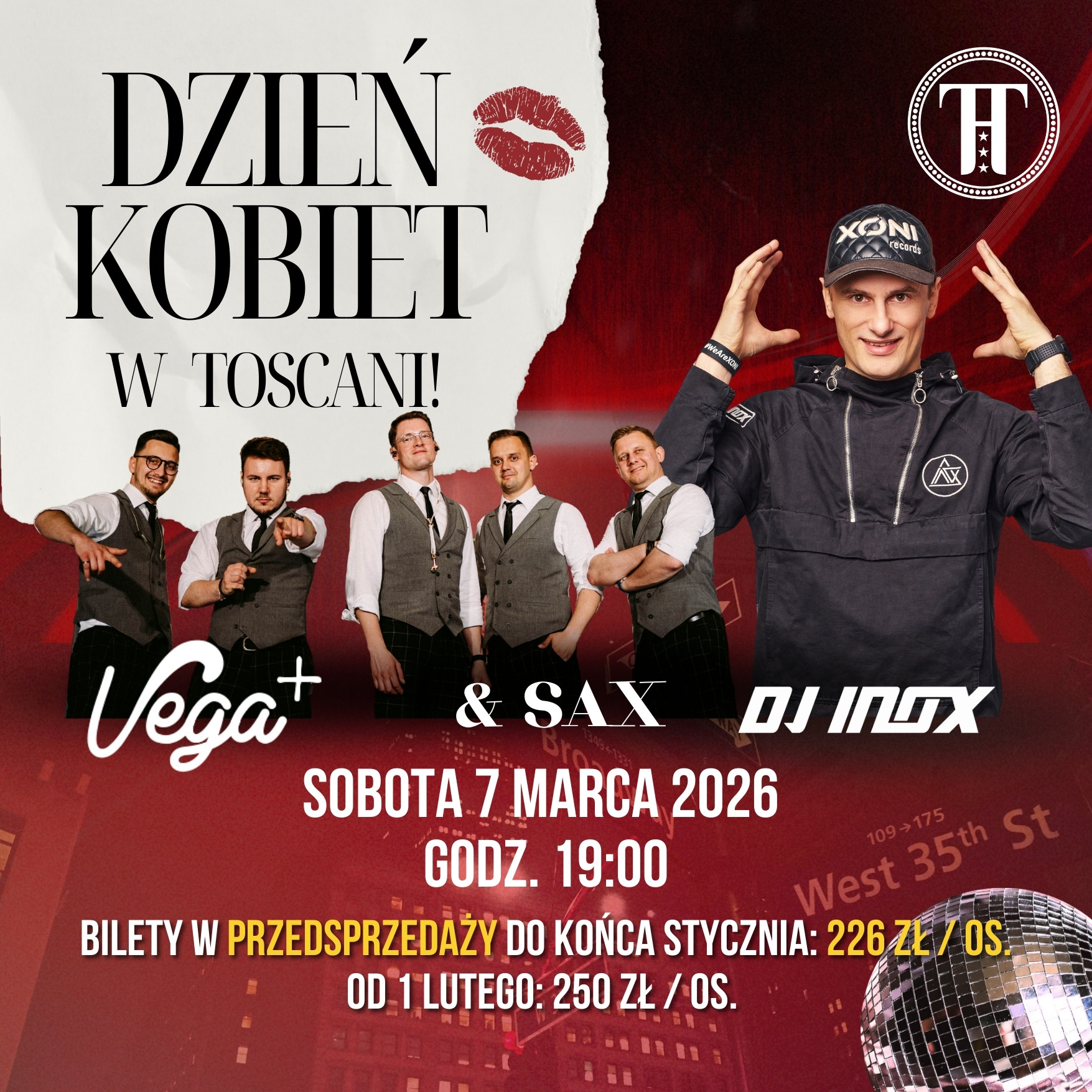 | Miejscowość: WŁOSZAKOWICE Miejsce: Sala Balowa Toscania Data rozpoczęcia: 07.03.2026 19:00:00 Data zakończenia: 08.03.2026 03:00:00 Organizator: Toscania Włoszakowice Opis wydarzenia: Najbardziej wyczekiwane wydarzenie roku - Dzień Kobiet w Toscani! Sobota 7 marca 2026 | godz. 19:00 Imprezę poprowadząL VEGA + & SAX oraz DJ INOX! W cenie biletu: atrakcyjne menu oraz napoje, niezapomniana zabawa, konkurs z nagrodami! Bilety w przedsprzedaży do końca stycznia 226 zł / os., od 1 lutego 250 zł / os. Rezerwacje: Beata Adamczak-Olwagen 693 810 890 Hotel Toscania 603 610 620 Dla uczestniczek rabat na nocleg w hotelu Toscania! |
