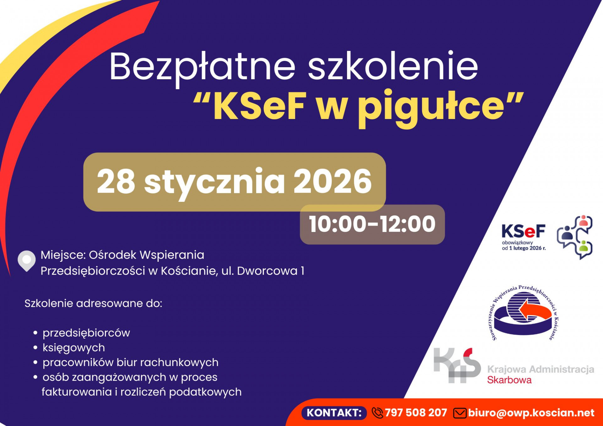 Opis wydarzenia: Naczelnik Urzędu Skarbowego w Kościanie we współpracy ze Stowarzyszeniem Wspierania Przedsiębiorczości w Kościanie zaprasza na szkolenie poświęcone Krajowemu Systemowi e-Faktur.