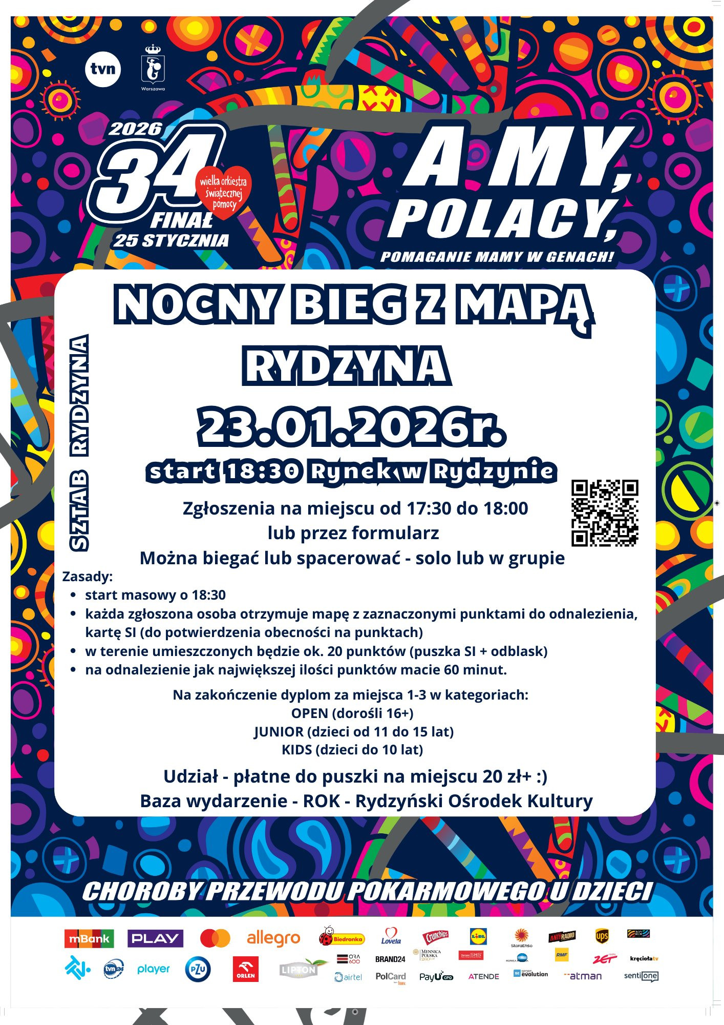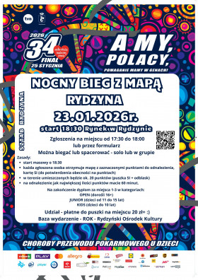 | Miejscowość: Rydzyna Miejsce: Rynek w Rydzynie - GOK Data rozpoczęcia: 23.01.2026 18:00:00 Data zakończenia: 23.01.2026 20:00:00 Organizator: UKS DAB LESZNO + SZTAB WOŚP W RYDZYNIE Opis wydarzenia: NOCNY BIEG Z MAPĄ – RYDZYNA Gramy razem z 34. Finałem WOŚP 23 stycznia 2026 r. Start: 18:30 Rynek w Rydzynie Biegasz? A może wolisz spacer? Możesz wystartować solo lub w grupie i w ciągu 60 minut odnaleźć jak najwięcej punktów zaznaczonych na mapie! Każdy uczestnik otrzyma mapę oraz kartę SI Około 20 punktów do odnalezienia w terenie ategorie: • OPEN (16+) • JUNIOR (11–15 lat) • KIDS (do 10 lat) Na najlepszych czekają dyplomy (miejsca 1–3) Udział: 20 zł do puszki WOŚP (na miejscu) Zgłoszenia na miejscu: 17:30–18:00 lub przez formularz - DOSTĘPNY NA FB UKS DĄB LESZNO - I WYDARZENIU: NOCNY BIEG Z MAPĄ – RYDZYNA Baza wydarzenia: ROK – Rydzyński Ośrodek Kultury Pomagamy, bo możemy – pomaganie mamy w genach! Gramy dla dzieci z chorobami przewodu pokarmowego Zabierz znajomych i widzimy się na starcie! |