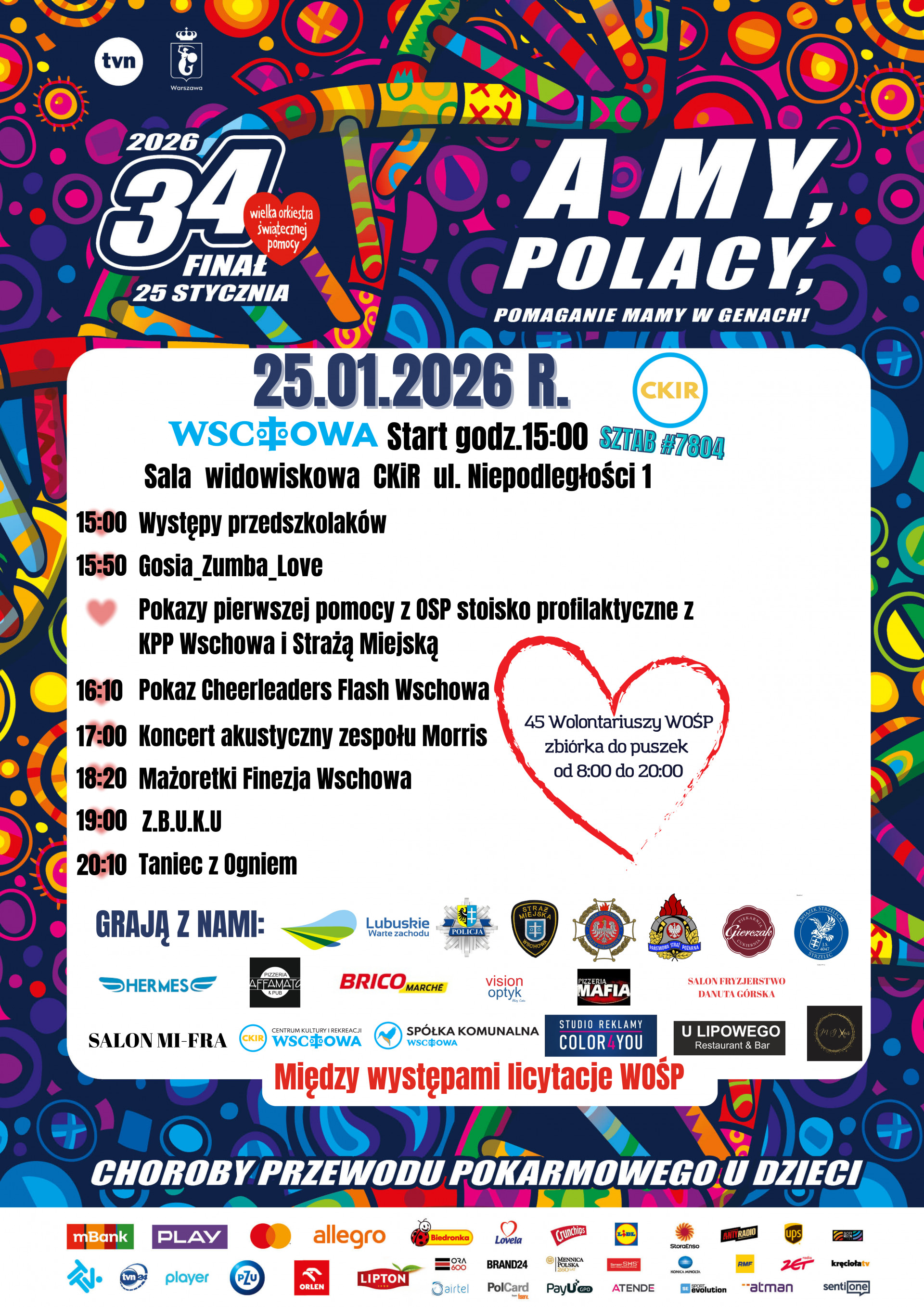| Miejscowość: Wschowa Miejsce: Centrum Kultury i Rekreacji we Wschowie Data rozpoczęcia: 25.01.2026 15:00:00 Data zakończenia: 25.01.2026 20:30:00 Organizator: Centrum Kultury i Rekreacji we Wschowie Opis wydarzenia: 25 stycznia 2026 r. | Start godz. 15:00 Sala widowiskowa CKiR, ul. Niepodległości 1 Hasło tegorocznego finału mówi wszystko: A MY, POLACY – POMAGANIE MAMY W GENACH! Przed nami dzień pełen emocji, muzyki i wspólnego pomagania! W programie m.in.: 15:00 – Występy przedszkolaków 15:50 – Gosia_Zumba_Love Pokazy pierwszej pomocy (OSP, KPP Wschowa, Straż Miejska) 16:10 – Cheerleaders Flash Wschowa 17:00 – Koncert akustyczny zespołu Morris 18:20 – Mażoretki Finezja Wschowa 19:00 – Z.B.U.K.U 20:10 – Taniec z ogniem 45 wolontariuszy WOŚP będzie kwestować od 8:00 do 20:00 Między występami – licytacje WOŚP Gramy razem dla dzieci i wsparcia w leczeniu chorób przewodu pokarmowego. Bądźcie z nami, wrzućcie do puszki, pokażmy wielkie serca Wschowy! |