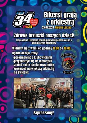 | Miejscowość: Leszno Miejsce: GALERIA LESZNO Data rozpoczęcia: 25.01.2026 11:00:00 Data zakończenia: 25.01.2026 16:00:00 Organizator: Klub Motocyklowy Bikers Legion Leszno i Galeria Leszno Opis wydarzenia: WOŚP 2026 W dniu 25.01.2026r. zapraszamy wszystkich w gościnne progi Galerii Leszno, gdzie od godz. 11.00 do godz.16.00, będziemy kwestować w ramach 34 FINAŁU WOŚP. Wystawimy, jak co roku, kilka maszyn, do których każdy będzie mógł się przymierzyć i zrobić pamiątkowe fotki. Będziemy odpowiadać na Wasze pytania dotyczące motocykli, naszej pasji i klubu - służymy radą i pomocą. Dla dzieci będą specjalne motocykle czyli pit bike a dla każdego małego ofiarodawcy przygotowaliśmy niespodziankę! Wspólnie z nami będzie też ekipa ze Stowarzyszenia Moto Rescue z pokazem pierwszej pomocy. Zapraszamy całe rodziny, każdego kto chce wspomóc, choćby niewielkim datkiem, cele 34 FINAŁU! Gwarantujemy duuuużo dobrego humoru i świetnej zabawy! Do zobaczenia! |