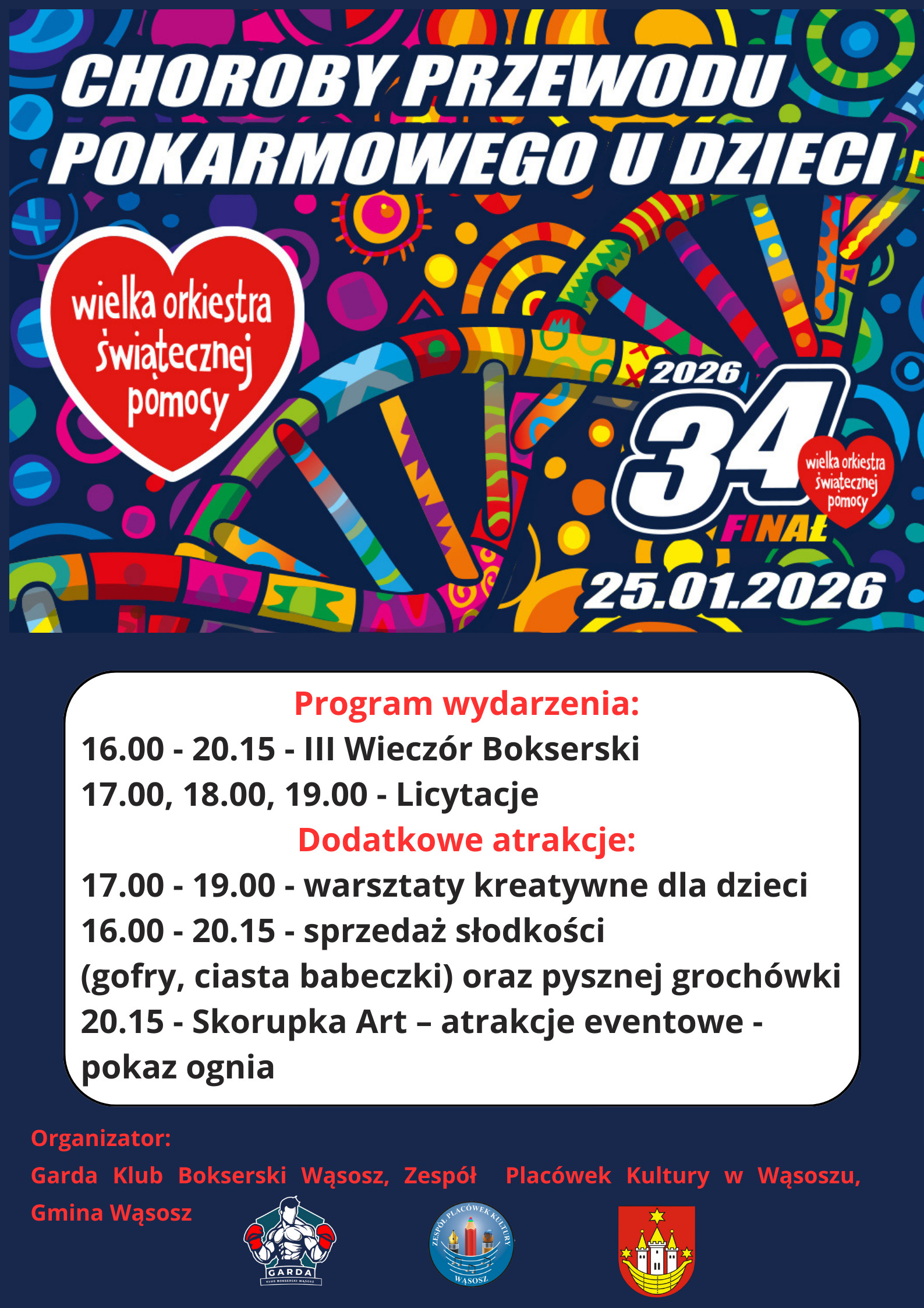 | Miejscowość: Wąsosz Miejsce: Zespół Placówek Kultury w Wąsoszu Data rozpoczęcia: 25.01.2026 16:00:00 Data zakończenia: 25.01.2026 21:00:00 Organizator: Zespół Placówek Kultury w Wąsoszu, Garda Klub Bokserski, Gmina Wąsosz Opis wydarzenia: Finał WOŚP w Wąsoszu – 25 stycznia! |