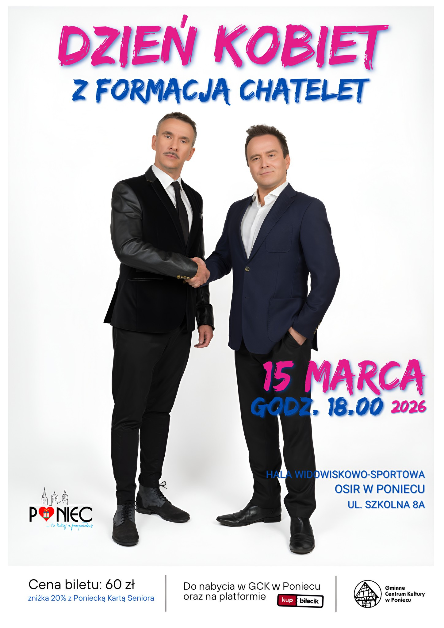 | Miejscowość: Poniec Miejsce: Poniec- Hala OSiR Data rozpoczęcia: 15.03.2026 18:00:00 Data zakończenia: 15.03.2026 19:30:00 Organizator: Gminne Centrum Kultury w Poniecu Opis wydarzenia: Już 15 marca w Poniecu świętujemy Dzień Kobiet z humorem i klasą! Na scenie: Formacja Chatelet – gwarancja świetnej zabawy, błyskotliwych skeczy i wieczoru pełnego śmiechu, mistrzowie kabaretu, którzy rozbawią Was do łez! To będzie wyjątkowy wieczór – po raz pierwszy w Poniecu wystąpi kabaret z okazji Dnia Kobiet! Zabierz przyjaciółki, mamę, babcię albo partnera i spędźcie razem niezapomniany wieczór Sprzedaż biletów rusza 28 stycznia - w siedzibie Gminnego Centrum Kultury w Poniecu - oraz na portalu KupBilecik Liczba miejsc ograniczona! Zniżka dla posiadaczy Ponieckiej Karty Seniora Formacja Chatelet - 15.03.2026r. (niedziela) Hala Widowiskowo-Sportowa OSiR w Poniecu Godz. 18:00 |