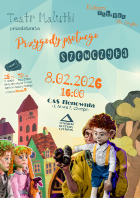 | Miejscowość: Czempiń Miejsce: CAS Tlenownia Data rozpoczęcia: 08.02.2026 16:00:00 Data zakończenia: 08.02.2026 17:00:00 Organizator: Centrum Kultury Czempiń Opis wydarzenia: Zapraszamy na kolejne teatralne spotkanie w ramach cyklu Kultury Fabryka dla Smyka. Tym razem aktorzy Teatru Malutki zapraszają na spektakl "Przygody psotnego szewczyka". Co to będzie za opowieść? Poczytajcie, co piszą o niej autorzy: "Młody szewczyk zamiast szyć buty, woli płatać figle — aż całe miasteczko ma go dość. Wyrusza więc w świat i spotyka Kaczora Kwaka, kompana do żartów i przygód. Psoty początkowo bawią, ale czasem potrafią kogoś zranić. Dopiero spotkanie z mądrym Staruszkiem uczy bohaterów, że najlepszy śmiech to taki, który nikogo nie krzywdzi. Od tej chwili postanawiają rozweselać świat bez złośliwości, a ich największym zadaniem staje się... przywrócić uśmiech Królowi Powidło. Na podstawie opowiadania Kornela Makuszyńskiego.” Bilety, w cenie 25 zł (z Czempińską Kartą Mieszkańca) oraz 30 zł (bez karty) do nabycia na stronie www.ck-kulturaczempin.bilety24.pl oraz w kasie Centrum Kultury Czempiń. |