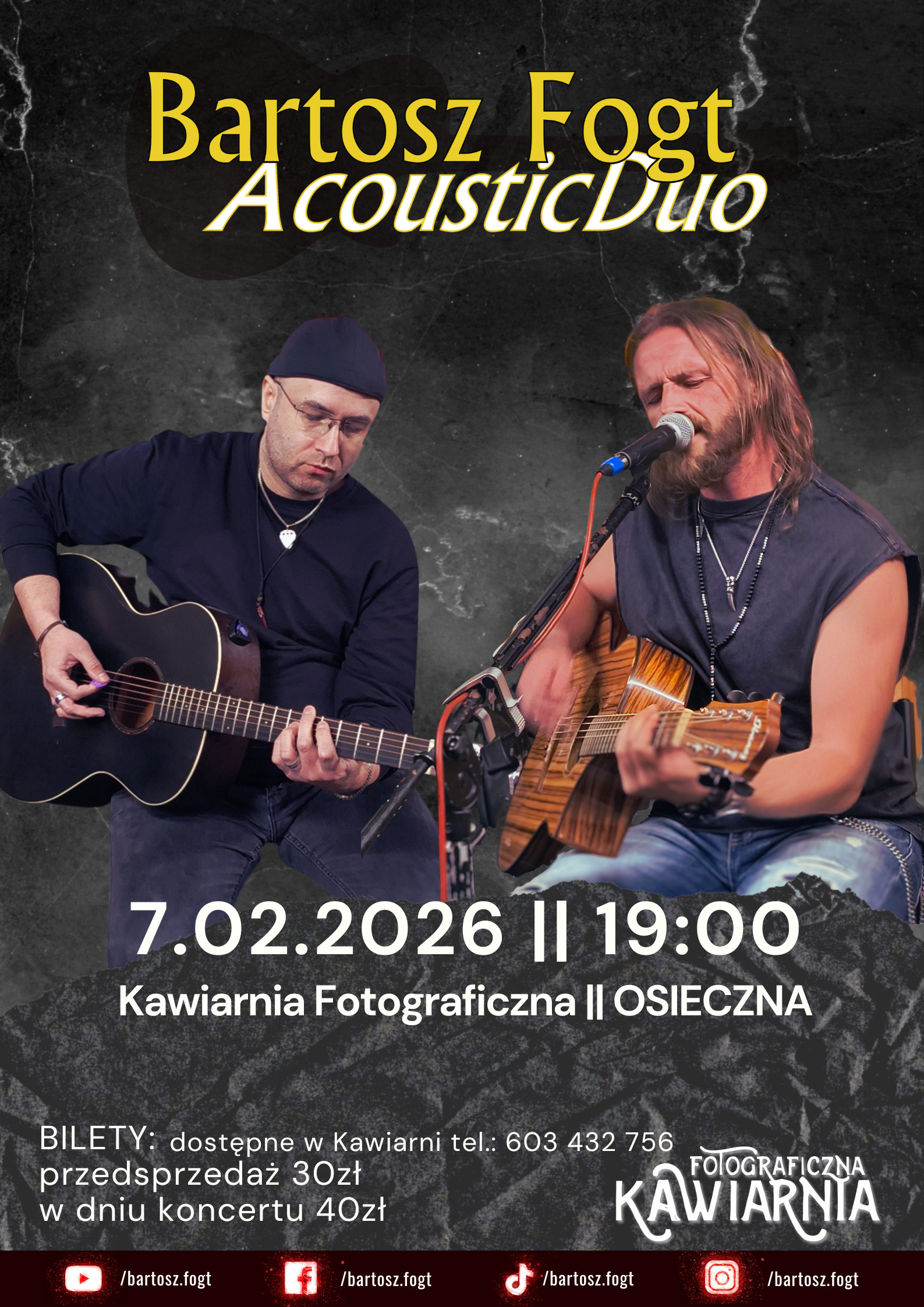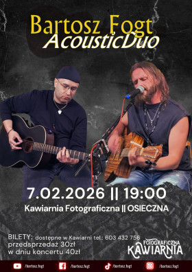 | Miejscowość: Osieczna Miejsce: Kawiarnia Fotograficzna Data rozpoczęcia: 07.02.2026 19:00:00 Data zakończenia: 07.02.2026 21:00:00 Organizator: Kawiarnia Fotograficzna Opis wydarzenia: Pierwszy taki nasz koncert w Osiecznej. Było kilka(naście?) koncertów solowych, był List do R. z Kubą czy "Walentynki" z Damianem właśnie... ale nigdy nie mieliśmy okazji zagrać dla Was z Damianem na totalnym luzie... tego co lubimy najbardziej, czyli energetycznej mieszanki bluesa i rocka!! Ta okazja nadarzy się już 7 lutego w miejscu, które zawsze wypełnia się wyjątkowym klimatem podczas grania - Kawiarnia Fotograficzna w Osiecznej. Od Beatlesów, Phila Collinsa po Bon Jovi czy Metallicę. Od Dżemu po Kult czy Irę. Gwarantujemy mnóstwo "standardów" i mnóstwo pozytywnej energii! |