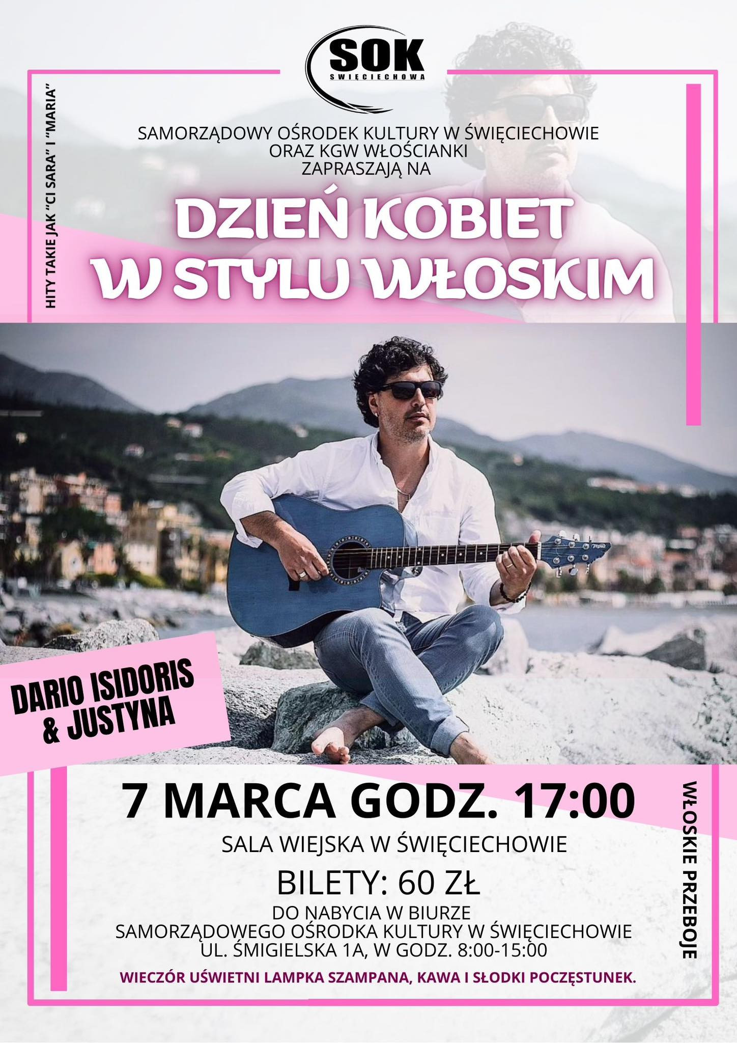 | Miejscowość: Święciechowa Miejsce: Sala Wiejska w Święciechowie Data rozpoczęcia: 07.03.2026 17:00:00 Data zakończenia: 07.03.2026 19:00:00 Organizator: Samorządowy Ośrodek Kultury w Święciechowie Opis wydarzenia: Dzień Kobiet w stylu włoskim! Zapraszamy na wyjątkowy, muzyczny wieczór pełen słońca, emocji i włoskich przebojów. Dario Isidoris & Justyna zabiorą nas w muzyczną podróż do Italii – usłyszycie hity takie jak „Ci Sarà”, „Mamma Maria” i wiele innych znanych włoskich melodii, które rozgrzewają serca! 7 marca, godz. 17:00, Sala Wiejska w Święciechowie. Bilety: 60 zł do nabycia w biurze SOK (ul. Śmigielska 1A, godz. 8:00–15:00). Liczba miejsc ograniczona. Wieczór uświetni lampka szampana, kawa i słodki poczęstunek - bo Dzień Kobiet warto świętować wyjątkowo. Do zobaczenia! |
