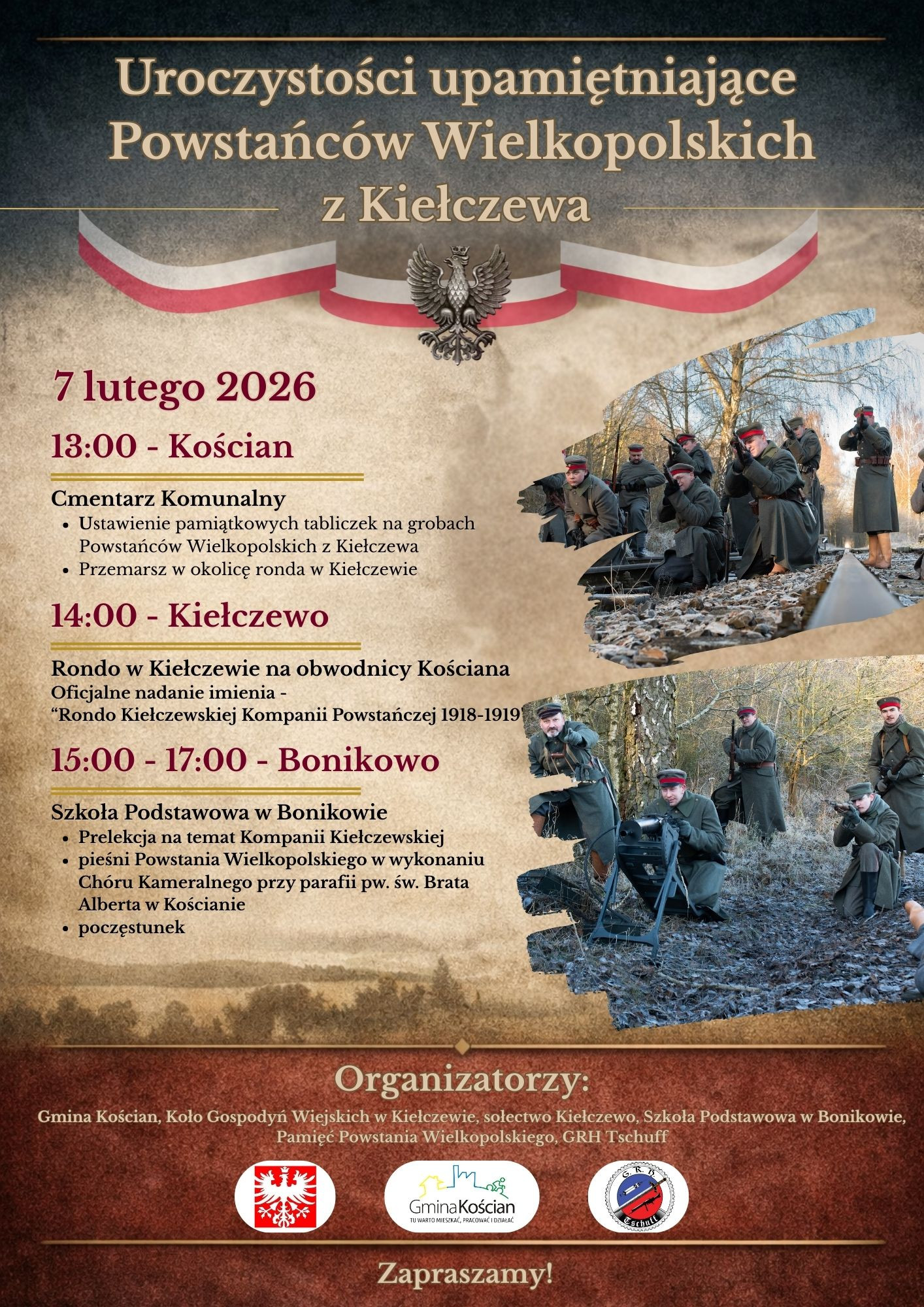 | Miejscowość: Kościan, Kiełczewo Miejsce: Kościan, Kiełczewo Data rozpoczęcia: 07.02.2026 13:00:00 Data zakończenia: 07.02.2026 17:20:00 Organizator: Gmina Kościan, Koło Gospodyń Wiejskich w Kiełczewie, Sołectwo Kiełczewo, Szkoła Podstawowa w Bonikowie, Pamięć Powstania Wielkopolskiego, GRH Tschuff Opis wydarzenia: Uroczystości upamiętniające Powstańców Wielkopolskich z Kiełczewa, które odbędą się 7 lutego 2026 r. (sobota). Program wydarzenia: 13:00 – Kościan, Cmentarz Komunalny ustawienie pamiątkowych tabliczek na grobach Powstańców Wielkopolskich z Kiełczewa przemarsz w okolice ronda w Kiełczewie 14:00 – Kiełczewo, rondo na obwodnicy Kościana oficjalne nadanie imienia „Rondo Kiełczewskiej Kompanii Powstańczej 1918–1919” 15:00–17:00 – Bonikowo, Szkoła Podstawowa -prelekcja o Kompanii Kiełczewskiej oraz wystawa pamiątek związanych z Powstaniem Wielkopolskim przygotowana przez Stowarzyszenie Historyczne Cichociemnych Spadochroniarzy Armii Krajowej i Izba Pamięci w Wilkowie Polskim -pieśni Powstania Wielkopolskiego w wykonaniu Chóru Kameralnego przy parafii pw. św. Brata Alberta w Kościanie -poczęstunek To wyjątkowa okazja do wspólnego oddania hołdu bohaterom, którzy walczyli o niepodległość naszej Ojczyzny oraz do pielęgnowania lokalnej pamięci historycznej. Zapraszamy do udziału całe rodziny! Organizatorzy: Gmina Kościan, Koło Gospodyń Wiejskich w Kiełczewie, Sołectwo Kiełczewo, Szkoła Podstawowa w Bonikowie, Pamięć Powstania Wielkopolskiego, GRH Tschuff |