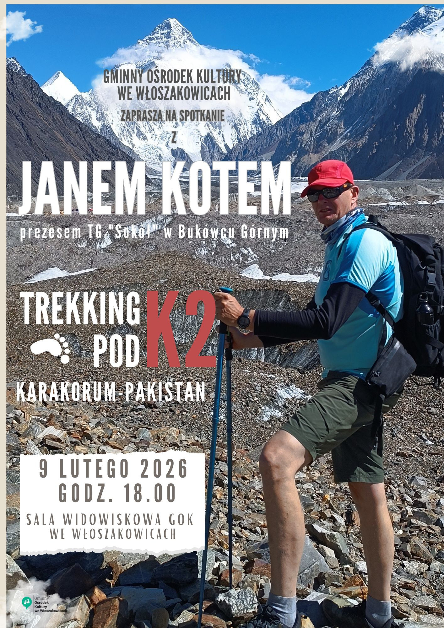 | Miejscowość: Włoszakowice Miejsce: Sala Widowiskowa GOK we Włoszakowicach Data rozpoczęcia: 09.02.2026 18:00:00 Data zakończenia: 09.02.2026 19:30:00 Organizator: Gminny Ośrodek Kultury we Włoszakowicach Opis wydarzenia: Gminny Ośrodek Kultury we Włoszakowicach serdecznie zaprasza na spotkanie podróżnicze z Janem Kotem pt. „Trekking pod K2”, które odbędzie się w poniedziałek, 9 lutego, o godz. 18:00 w sali widowiskowej GOK. Wstęp wolny. Będzie to opowieść o drugiej wysokogórskiej wyprawie prelegenta – trzytygodniowej podróży do Pakistanu, w tym 16-dniowym marszu do baz alpinistów. Noclegi w namiotach, intensywny wysiłek fizyczny, codzienne wyzwania oraz surowe, zapierające dech w piersiach krajobrazy Karakorum złożyły się na prawdziwą górską przygodę. Podczas spotkania uczestnicy zobaczą filmy i zdjęcia, a także wysłuchają opowieści o miastach, wsiach, mieszkańcach Pakistanu oraz samych górach. Nie zabraknie również anegdot o górskiej codzienności – bąblach, szarej taśmie i trytytkach, które czasem ratują życie. Jan Kot, prezes Towarzystwa Gimnastycznego „Sokół” w Bukówcu, podróżował z grupą znanej himalaistki Moniki Witkowskiej. Ma już na swoim koncie podobną wyprawę pod Everest. Ciekawostką spotkania będzie również strój ludowy prelegenta – zdecydowanie nie bukówiecki. Zapraszamy wszystkich miłośników gór i podróży. |