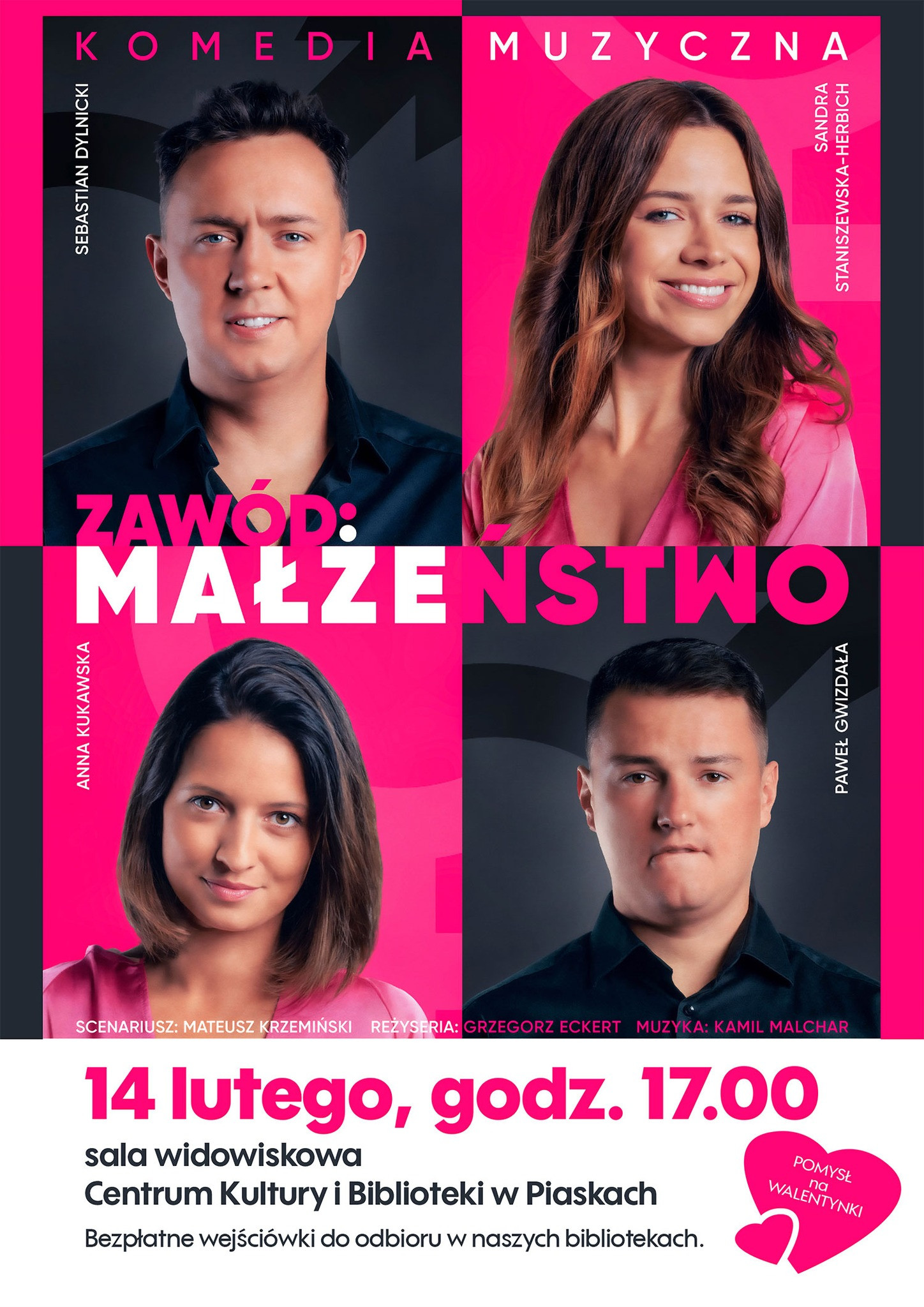 | Miejscowość: Piaski Miejsce: Piaski Data rozpoczęcia: 14.02.2026 17:00:00 Data zakończenia: 14.02.2026 18:00:00 Organizator: Centrum Kultury i Biblioteka w Piaskach Opis wydarzenia: Walentynki z uśmiechem! Komedia muzyczna „Zawód: Małżeństwo” Zapraszamy na wyjątkowy, walentynkowy wieczór pełen śmiechu, muzyki i… życiowych prawd Bezpłatne wejściówki do odbioru w naszych bibliotekach – pospieszcie się, liczba miejsc ograniczona! „Zawód: Małżeństwo” to muzyczna komedia, która nie tylko bawi do łez, ale też wzrusza i skłania do refleksji. W 10. rocznicę ślubu mąż i żona zamiast romantycznego weekendu trafiają do zrujnowanej chaty… On miał plan, ona miała oczekiwania – a życie? Jak zwykle napisało własny scenariusz Zobaczycie małżeństwo w krzywym zwierciadle Pośmiejecie się z sytuacji, które wszyscy znamy Wyjdziecie z lekkim sercem i dobrym nastrojem Dlaczego warto? wieczór pełen śmiechu i świetnej zabawy połączenie muzyki, emocji i błyskotliwego humoru znane i lubiane utwory: „Brunetki, blondynki”, „Lubię wracać tam gdzie byłem”, „Gdzie ci mężczyźni” oraz piosenki Kabaretu Starszych Panów doświadczeni, charyzmatyczni aktorzy na scenie Bo śmiech to najlepsza terapia – także dla każdej pary! Zapraszamy na walentynkowy wieczór z humorem |