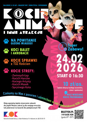 | Miejscowość: Kościan Miejsce: Kościański Ośrodek Kultury Data rozpoczęcia: 24.02.2026 16:30:00 Data zakończenia: 24.02.2026 18:30:00 Organizator: Kościański Ośrodek Kultury Opis wydarzenia: 24 lutego zapraszamy na FERIE Z PAZUREM: Wielkie Kocie Harce w Kościańskim Ośrodku Kultury! Zmień ferie swojego dziecka w wielką przygodę! Zapraszamy na interaktywne wydarzenie, które łączy magię teatru, sportową energię i lekcję empatii. KLUCZOWE INFORMACJE: KIEDY: 24 lutego 2026 (wtorek) GODZINA: 16:30 – 18:30 WIEK: 5–10 lat (dzieci do lat 7 zapraszamy z opiekunem) BILET: 10 zł / osoba (obowiązuje dzieci i opiekunów) MIEJSCE: Sala widowiskowa KO (Bilety dostępne również w kasie KOK, godz. 8:00–15:00) CO CZEKA NA MAŁYCH ODKRYWCÓW? Pod opieką profesjonalnych animatorów z naszej BOBOTEKI, dzieci wyruszą w podróż do świata kocich tajemnic: Start o godz.16:30 Wielkie MIAUUU! – głośne powitanie na przełamanie lodów. Koci Balet i Akrobacje – profesjonalny pokaz zwinności i tańca. Kocie Sprawki z TOZ Kościan – jak rozumieć mowę kotów? (Lekcja empatii). 4 STREFY PRZYGODY: Zwinne Łapy – tor przeszkód i ruchowe wyzwania. Sprytny Kot – zagadki dla małych detektywów. Koci Artysta – warsztaty tworzenia masek. Misja Specjalna – zrób zabawkę dla swojego pupila lub dla kotów z TOZ! DLACZEGO WARTO DO NAS DOŁĄCZYĆ? To spotkanie to coś znacznie więcej niż wypełnienie wolnego czasu poprzez zabawę. To inwestycja w rozwój dziecka. Detoks od ekranów: Gwarantujemy 2 godziny realnej zabawy i budowania więzi z rówieśnikami. Nauka przez zabawę: Wspólnie z TOZ Kościan uczymy wrażliwości na los zwierząt. Rozwój fizyczny: Animacje ruchowe stymulują koordynację i sensorykę dziecka. Bezpieczeństwo: Zabawa odbywa się w pełnej zrozumienia atmosferze pod okiem ekspertów. =^.^= KOCI DRESS CODE Zachęcamy do ubrania uszek, ogonków lub domalowania wąsików! To pomaga dzieciom przełamać nieśmiałość i wejść w świat zabawy. MASZ PYTANIA? Jesteśmy do Twojej dyspozycji: tel. (65) 512-05-75 (pon.-pt., 8:00–15:00) Bilety dostępne w kasie KOK w godz. od 8:00 do 15:00 oraz na www.bilety24.pl Postaw na zabawę, która rozwija, uczy i pomaga. Czekamy na Was w KOK-u z pazurem i uśmiechem! |