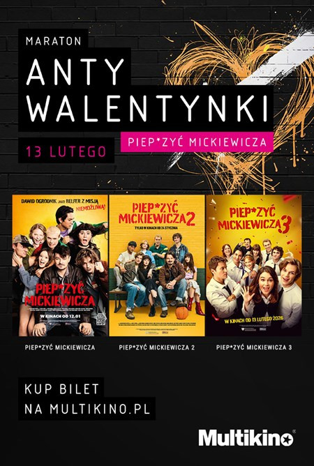 | Miejscowość: Leszno Miejsce: Multikino Leszno Data rozpoczęcia: 13.02.2026 22:30:00 Data zakończenia: 14.02.2026 04:10:00 Organizator: Multikino Leszno Opis wydarzenia: Wybierz energię buntu. Poczuj autentyczność bez cenzury. Masz dość lukrowanych historii? Już 13 lutego 2026 r. Multikino zaprasza na noc pełną bezkompromisowej, młodzieńczej energii. Maraton Piep*zyć Mickiewicza to kompletna podróż przez losy nieszablonowego polonisty i jego uczniów, którzy udowadniają, że szkoła i życie mają znacznie więcej niż jedną twarz. To propozycja dla tych, którzy zamiast strachu wybierają bunt, lojalność i budowanie relacji na własnych zasadach. Maraton to coś więcej niż maraton filmowy – to pełne zanurzenie w historii o poszukiwaniu własnej tożsamości w świecie wymagającym dopasowania się do wzorców. Możesz przeżyć tę historię od samego początku aż po finałowe starcie z dorosłością, dzieląc emocje z paczką przyjaciół w wyjątkowej, kinowej atmosferze. To Twój wieczór i Twój wybór strony buntu. Dołącz do nas i przeżyj całą trylogię podczas jednej nocy. Kup bilet już dziś i postaw na filmową niezależność! |