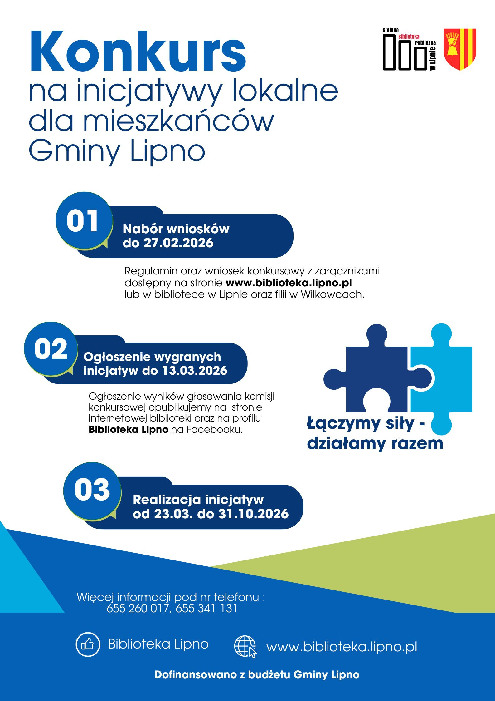 | Miejscowość: Lipno Miejsce: Gminna Biblioteka Publiczna w Lipnie Data rozpoczęcia: 03.02.2026 00:01:00 Data zakończenia: 27.02.2026 23:59:00 Organizator: Gminna Biblioteka Publiczna w Lipnie Opis wydarzenia: Gminna Biblioteka Publiczna w Lipnie już po raz czwarty organizuje konkurs na inicjatywy lokalne. Masz pomysł na ciekawe działania? Chcesz zorganizować wydarzenie dla mieszkańców gminy Lipno, które przy okazji będzie promowało czytanie? Weź udział w konkursie i wygraj 5 000 zł! Nagrodzimy 4 najlepsze pomysły na ciekawe wydarzenie, warsztaty, zajęcia, spotkania lub koncert dla mieszkańców gminy Lipno. Łączna pula środków przeznaczonych na konkurs wynosi 20 000 zł. Konkurs został dofinansowany z budżetu gminy Lipno. Regulamin wraz z załącznikami jest dostępny na stronie biblioteki: www.biblioteka.lipno.pl Zapraszamy do udziału w konkursie! |