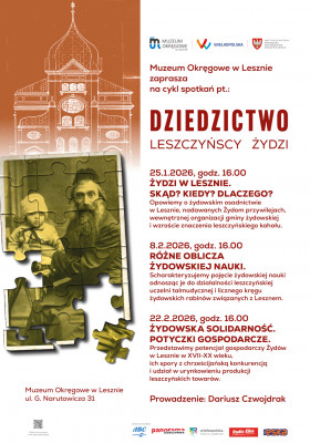 | Miejscowość: Leszno Miejsce: Muzeum Okręgowe w Lesznie. ul. G. Narutowicza 31 Data rozpoczęcia: 08.02.2026 16:00:00 Data zakończenia: 08.02.2026 17:00:00 Organizator: Muzeum Okręgowe w Lesznie Opis wydarzenia: 8 lutego 2026, godz. 16.00 – „Różne oblicza żydowskiej nauki” Scharakteryzujemy pojęcie żydowskiej nauki, odnosząc je do działalności leszczyńskiej uczelni talmudycznej i licznego kręgu żydowskich rabinów związanych z Lesznem. Miejsce: Muzeum Okręgowe w Lesznie, ul. G. Narutowicza 31 Kontakt: 65 529 61 40 w. 3 Obowiązuje wykupienie biletu wstępu. Zachęcamy do zapoznania się z regulaminem zwiedzania Muzeum. |