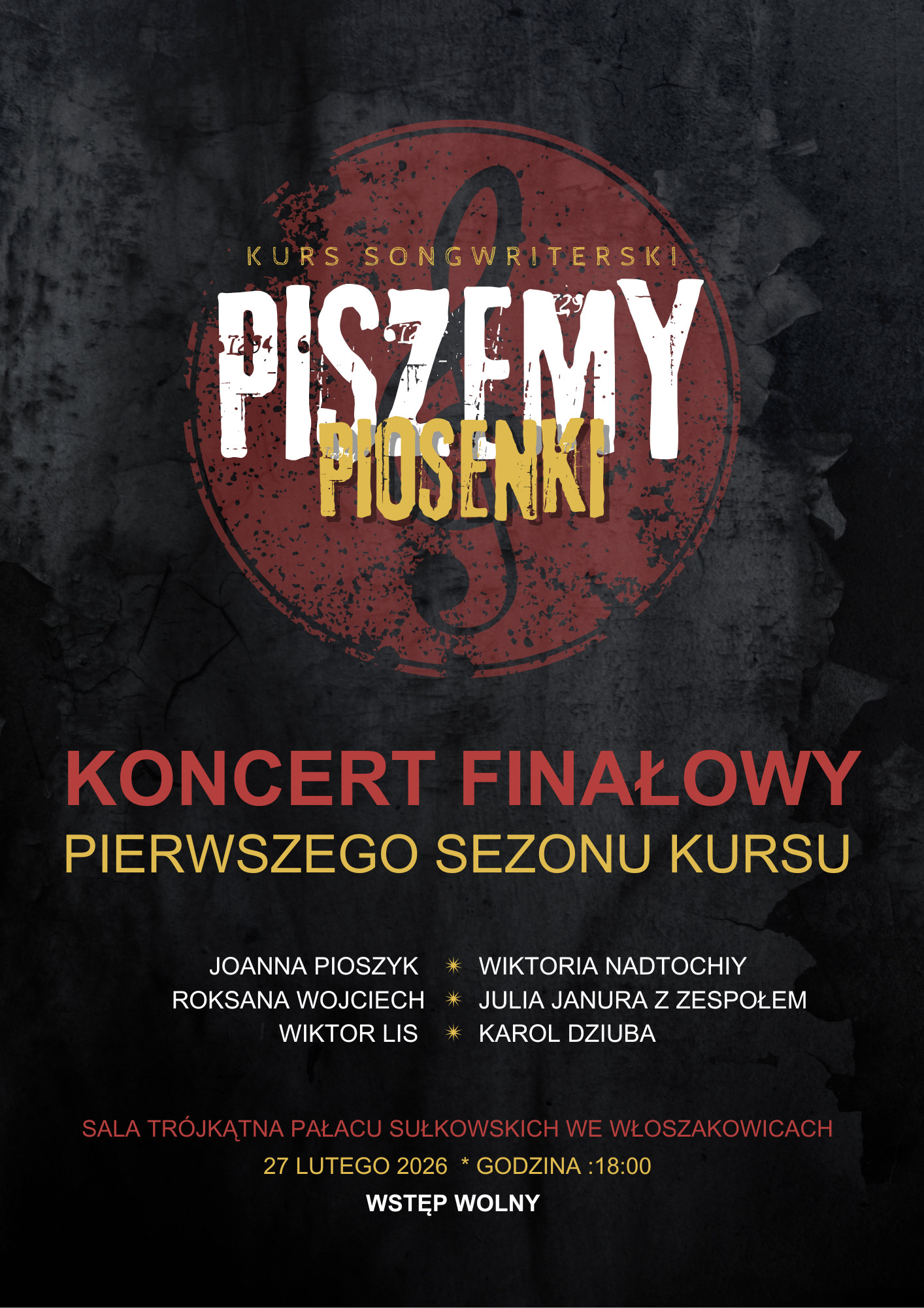 | Miejscowość: Włoszakowice Miejsce: Pałac Sułkowskich Data rozpoczęcia: 27.02.2026 18:00:00 Data zakończenia: 27.02.2026 19:30:00 Organizator: Gminny Ośrodek Kultury we Włoszakowicach Opis wydarzenia: Gminny Ośrodek Kultury we Włoszakowicach serdecznie zaprasza na unikatowy koncert! W piątek, 27 lutego, w Sali Trójkątnej Pałacu Sułkowskich we Włoszakowicach swoje piosenki wykona sześciu świeżo upieczonych tu tekściarzy. Będzie to finał warsztatów „Piszemy Piosenki”. Zaczynamy o 18:00. Tego wieczoru poznamy autorskie utwory, prawdziwe emocje oraz nowe muzyczne osobowości, które narodziły się właśnie we Włoszakowicach. Na scenie wystąpią uczestnicy unikatowych warsztatów organizowanych przez Gminny Ośrodek Kultury we Włoszakowicach, trwających od stycznia ubiegłego roku. Kursanci zaprezentują swoje najlepsze piosenki stworzone podczas zajęć. Wystąpią: Joanna Pioszyk Roksana Wojciech Wiktor Lis Wiktoria Nadtochiy Julia Janura z zespołem Karol Dziuba Zapraszamy na autentyczne muzyczne doświadczenie – osobiste historie opowiedziane dźwiękiem i słowem. Ten wieczór będzie jednak czymś więcej niż koncertem. Każdy z wykonawców może zgłosić jedną piosenkę do konkursu, którego stawką jest nagranie zwycięskiego utworu w profesjonalnym studiu oraz promocja medialna. Oceny dokona znakomite jury: - Aleksandra Zabłocka – wokalistka współpracująca m.in. z Andrzejem Krzywym, Robertem Rozmusem, Rudim Schubertem oraz Kabaretem pod Egidą - Marek Wąsowicz – Wójt Gminy Włoszakowice - Marcin Żyski – redaktor muzyczny Radia Poznań Występującym towarzyszyć będzie profesjonalny zespół muzyczny. Jeśli chcesz być świadkiem narodzin nowych piosenek, prawdziwych emocji i scenicznych osobowości — nie może Cię zabraknąć. 27 lutego Sala Trójkątna Pałacu Sułkowskich we Włoszakowicach Do zobaczenia! |