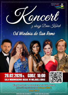 | Miejscowość: Miejska Górka Miejsce: Sala Widowiskowa OKSiAL Data rozpoczęcia: 28.02.2026 18:00:00 Data zakończenia: 28.02.2026 19:30:00 Organizator: Ośrodek Kultury, Sportu i Aktywności Lokalnej w Miejskiej Górce Opis wydarzenia: Koncert „Od Wiednia do San Remo” to wyjątkowe wydarzenie muzyczne, które łączy klasyczną elegancję z południowym temperamentem. Starannie dobrany repertuar, znakomici wykonawcy oraz niepowtarzalna atmosfera sprawiają, że wieczór ten staje się nie tylko koncertem, lecz prawdziwą muzyczną podróżą pełną emocji, wzruszeń i pięknych melodii. To doskonała propozycja dla wszystkich miłośników dobrej muzyki oraz wyjątkowa okazja do wspólnego świętowania Dnia Kobiet w artystycznym klimacie. Z okazji Dnia Kobiet zapraszamy Państwa na niezapomniany wieczór, który rozpocznie się w świecie eleganckich wiedeńskich walców, by następnie przenieść publiczność do słonecznej Italii i pełnych pasji przebojów znanych z festiwalu w San Remo. Koncert będzie pełen kontrastów, nastrojów i muzycznych emocji, które na długo pozostaną w pamięci słuchaczy. Na scenie wystąpią znakomici soliści poznańskich scen muzycznych: Agnieszka Wawrzyniak, Emilia Zielińska, Klaudiusz Kapłon oraz Aleksander Forkuszak. Towarzyszyć im będzie skrzypaczka Barbara Szelągiewicz, której interpretacje dodadzą całości wyjątkowej elegancji i subtelności. Wydarzenie odbędzie się w sobotę, 28 lutego br. o godz. 18.00. Bilety w cenie 20 zł dostępne będą od 9 lutego w siedzibie OKSiAL (sekretariat, godz. 8.00–16.00, sprzedaż bezgotówkowa). Serdecznie zapraszamy do wspólnego świętowania Dnia Kobiet przy dźwiękach pięknej muzyki – pełnej elegancji, pasji i niezapomnianych wrażeń. |