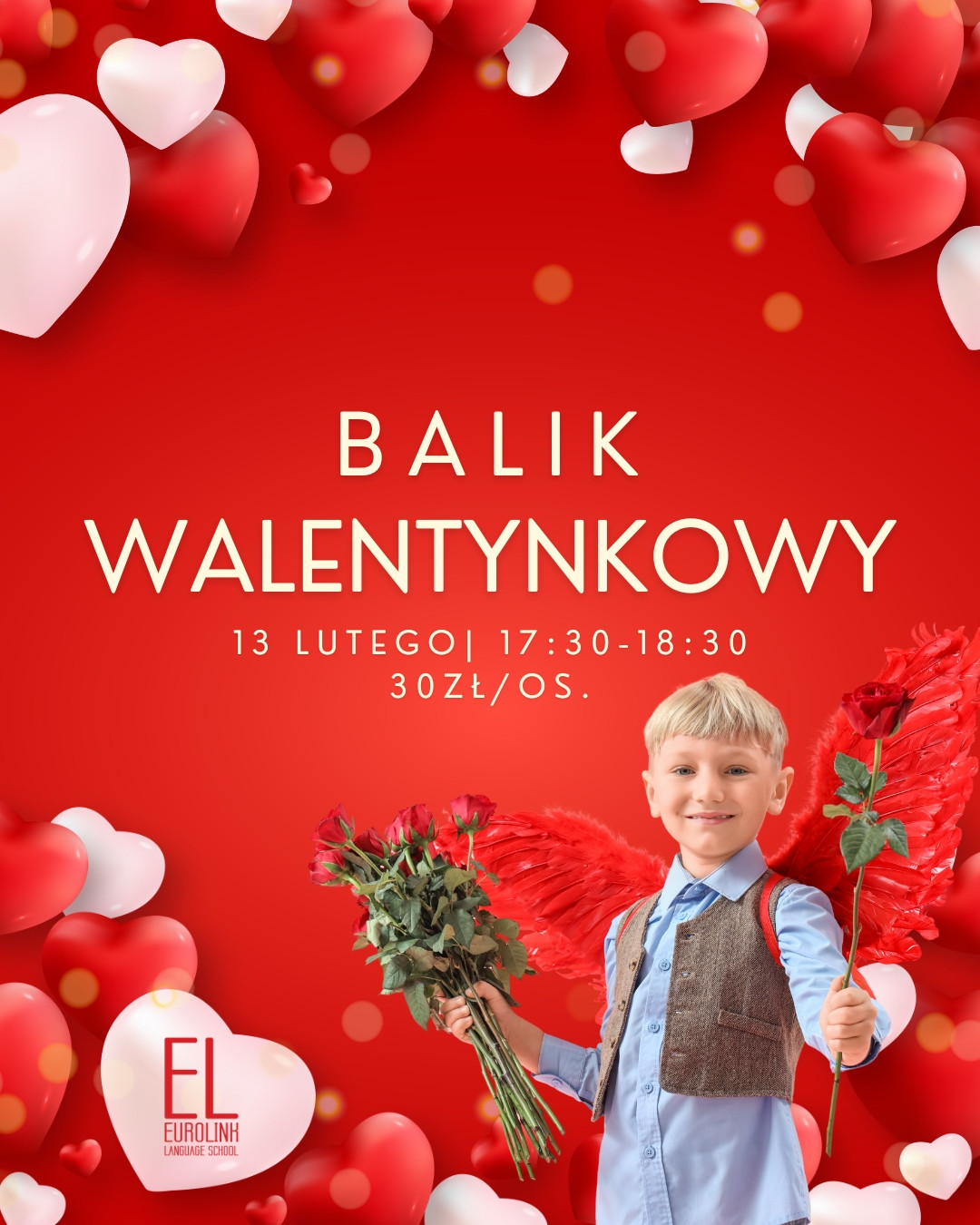 | Miejscowość: Leszno Miejsce: Łużycka 1A Data rozpoczęcia: 13.02.2026 17:30:00 Data zakończenia: 13.02.2026 18:30:00 Organizator: Szkoła Językowa Eurolink Opis wydarzenia: Zakochaj się w karnawale z Eurolink! Już 13 lutego 2026 roku, od godziny 17:30 do 18:30, zapraszamy na niezwykły Walentynkowy Balik Karnawałowy! W planie mnóstwo radości, tańców, zabaw i niespodzianek, które oczarują naszych małych uczestników. Przygotowaliśmy kreatywne warsztaty, gry i eksperymenty, a także przerwę na przekąski. Nie zabraknie uśmiechu, karnawałowych przebierańców i wyjątkowego klimatu – będzie niezapomnianie! Kilka ważnych informacji: Data: 13 lutego 2026 r. (piątek) Godzina: 17:30 – 18:30 Miejsce: Eurolink Cena: 30 zł/os. (zniżka -50% na rodzeństwo) Wiek uczestników - 0-8 lat (najmłodsi pod opieką rodziców!) Dodatkowo: Jeśli dziecko przychodzi z rodzicem, prosimy o zaznaczenie tego w formularzu – w końcu każdy maluch zasługuje na swojego walentynkowego kibica! Liczba miejsc jest ograniczona, dlatego nie zwlekaj – zapisz się już teraz! Pssst... Walentynkowe stroje (lub inny dowolny kostium) mile widziane! Zabierzcie ze sobą smaczne przekąski! Wypełnij formularz i baw się z nami na Walentynki! - https://forms.gle/1PRjJLYY3s566wHQA |