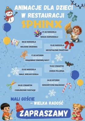 | Miejscowość: Leszno Miejsce: Galeria Leszno Data rozpoczęcia: 15.02.2026 13:00:00 Data zakończenia: 15.02.2026 17:00:00 Organizator: Restauracja Sphinx Opis wydarzenia: Zapraszamy wszystkie rodziny z dziećmi w wieku 3-12 lat na rodzinny obiad oraz na animacje w formie zajęć plastycznych o zimowej tematyce |