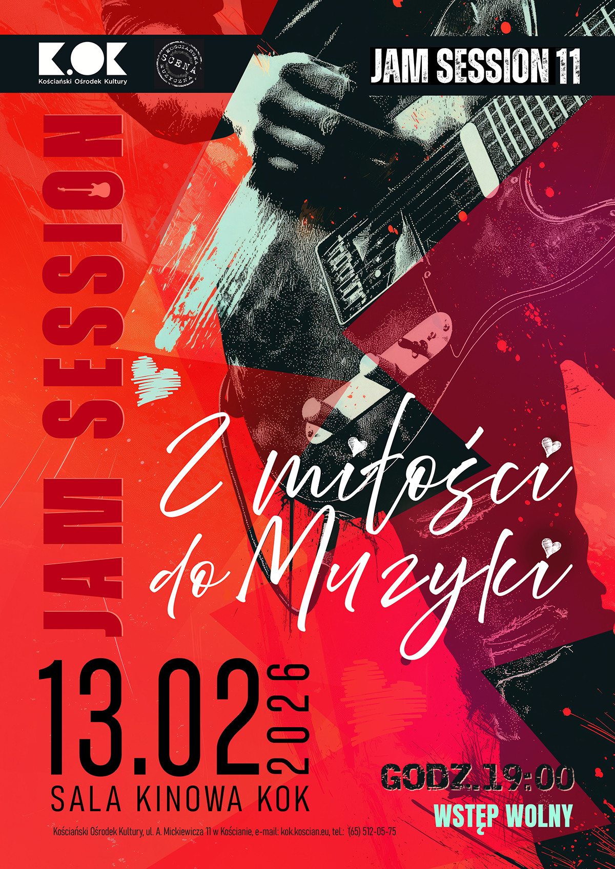 | Miejscowość: Kościan Miejsce: Kościański Ośrodek Kultury (Sala kinowa KOK-u ) Data rozpoczęcia: 13.02.2026 19:00:00 Data zakończenia: 13.02.2026 22:00:00 Organizator: Kościański Ośrodek Kultury Opis wydarzenia: Wieczór, który brzmi miłością Tu nie ma sztywnego scenariusza. Jest scena, światła, instrumenty i ludzie, których łączy jedno - pasja do muzyki. 13 lutego zapraszamy do Kościańskiego Ośrodka Kultury na Jam Session „Z miłości do muzyki”. To przestrzeń dla każdego! Niezależnie od tego, czy grasz od lat, czy dopiero zaczynasz. Możesz wejść na scenę i improwizować z innymi, zaprezentować swój materiał albo po prostu chłonąć atmosferę i dać się porwać dźwiękom tworzonym na żywo. Na miejscu czeka zaplecze techniczne (perkusja, wzmacniacze, pianino, nagłośnienie), więc zabierz instrument i dołącz do nas. |