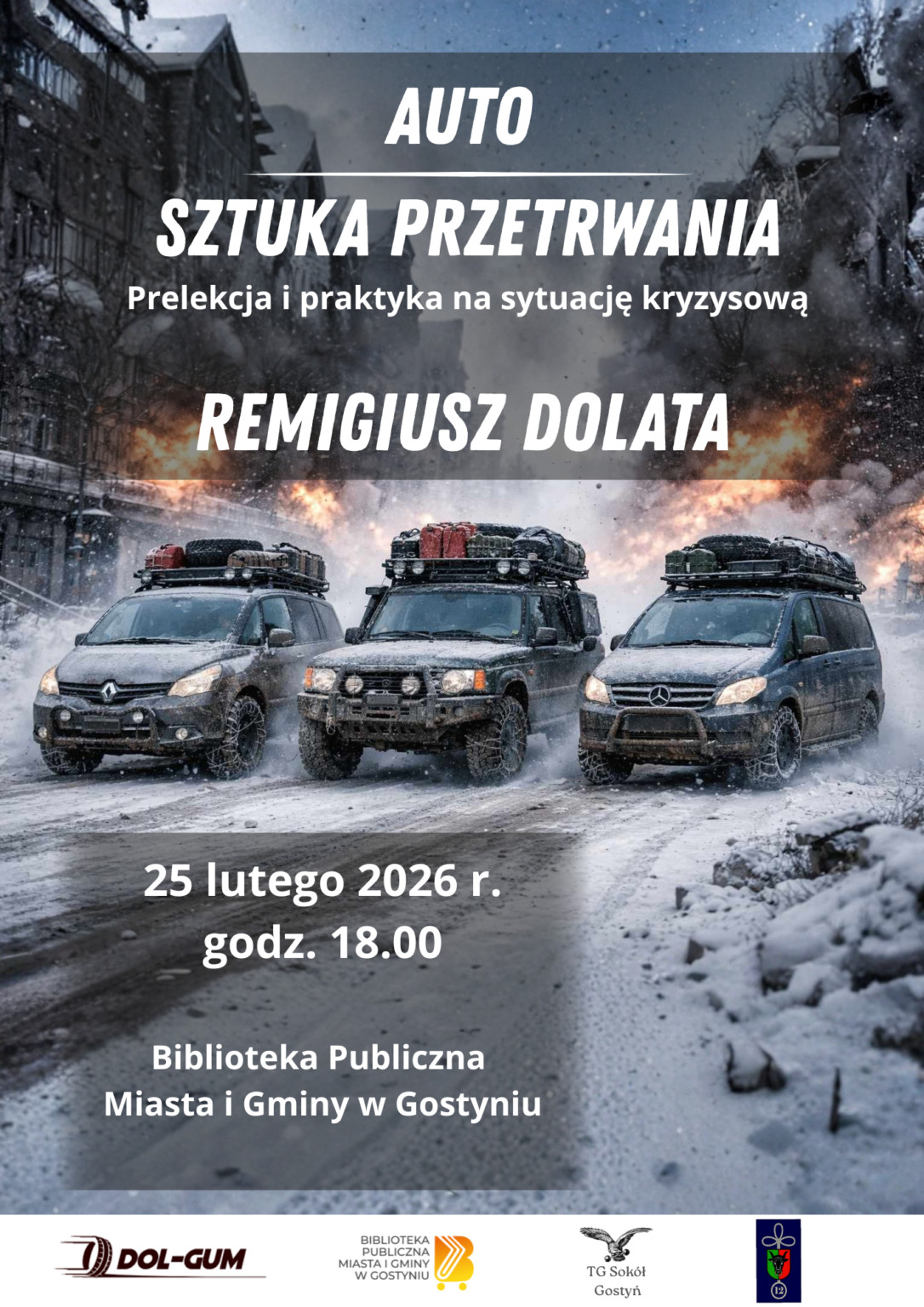 | Miejscowość: Gostyń Miejsce: Biblioteka w Gostyniu Data rozpoczęcia: 25.02.2026 18:00:00 Data zakończenia: 25.02.2026 20:00:00 Organizator: Biblioteka Publiczna Miasta i Gminy w Gostyniu Opis wydarzenia: Auto. Sztuka przetrwania. Jak przygotować pojazd na sytuację kryzysową? Data: środa, 25 lutego 2026 r. Godzina: 18:00 Miejsce: Biblioteka Publiczna Miasta i Gminy w Gostyniu Już 25 lutego o godz. 18.00 w Bibliotece Publicznej Miasta i Gminy w Gostyniu odbędzie się wyjątkowe spotkanie wpisujące się w wyzwania, które niesie współczesność. Czy zastanawiałeś się kiedyś, jak wyjedziesz z miasta w czasie ewakuacji? Co zrobisz, gdy sytuacja kryzysowa zatrzyma cię w podróży? Jak radzić sobie w pojeździe w sytuacjach zagrożenia? Czy ty i twoje auto jesteście przygotowani? Na te i inne pytania odpowie specjalista w zakresie bezpieczeństwa, sierżant Remigiusz Dolata – żołnierz i właściciel firmy z branży mechaniki pojazdów. Prelegent przedstawi zarówno teorię, jak i przede wszystkim praktyczne rozwiązania, które wypracował od lat, zgłębiając tę problematykę. Dzięki spotkaniu poznasz zasady postępowania, kwestie związane z medycyną, awarią, ratunkiem i samym przetrwaniem. Warto przyjść do biblioteki, by nauczyć się rzeczy, które mogą uratować twoje życie i zdrowie. Organizatorami i partnerami spotkania są: firma DOL-GUM, BPMiG w Gostyniu, TG Sokół w Gostyniu, 125. leszczyński batalion lekkiej piechoty. Wstęp wolny! |