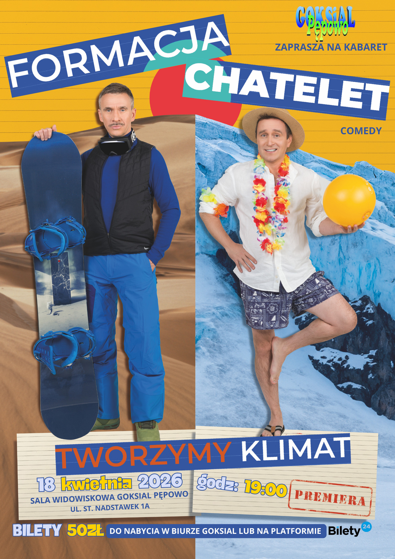 | Miejscowość: Pępowo Miejsce: sala widowiskowa GOKSiAL, ul. St. Nadstawek 1a Data rozpoczęcia: 18.04.2026 19:00:00 Data zakończenia: 18.04.2026 21:00:00 Organizator: GOKSiAL Pępowo Opis wydarzenia: „Tworzymy Klimat” to najnowszy program kultowego krakowskiego kabaretu Formacja Chatelet, działającego na scenie od 1996 roku. Występujący w duecie Adam Małczyk i Karol Wolski prezentują mieszankę kabaretu, teatru i stand-upu, stawiając na charyzmatyczne występy, improwizację oraz niepoprawny optymizm. Bilety w cenie 50 zł do nabycia w biurze GOKSiAL oraz na platformie bilety24.pl: https://www.bilety24.pl/kup-bilet-na-1443--tworzymy-klimat-formacja-chatelet-148908?id=883699#overall |