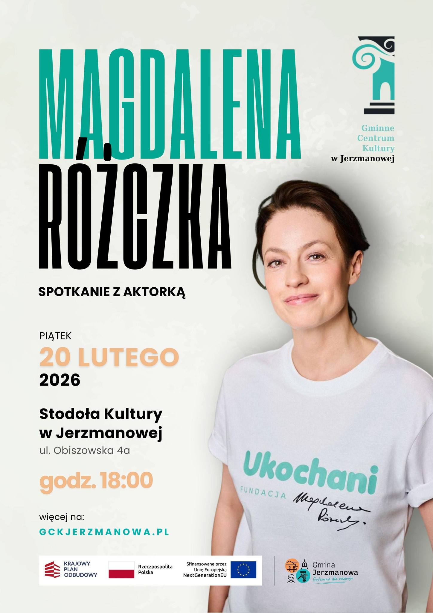 | Miejscowość: Jerzmanowa Miejsce: Stodoła Kultury Data rozpoczęcia: 20.02.2026 18:00:00 Data zakończenia: 20.02.2026 20:00:00 Organizator: Gminne Centrum Kultury w Jerzmanowej Opis wydarzenia: Już w piątek, 20 lutego 2026 r. zapraszamy na wyjątkowe spotkanie z jedną z najbardziej lubianych polskich aktorek – Magdaleną Różczką Stodoła Kultury w Jerzmanowej ul. Obiszowska 4a godz. 18:00 Wstęp wolny To będzie wieczór pełen rozmów, inspiracji i kulisów pracy aktorskiej – idealna okazja, by spotkać się na żywo, zadać pytania i spędzić czas w świetnej atmosferze Więcej informacji: gckjerzmanowa.pl Do zobaczenia! |