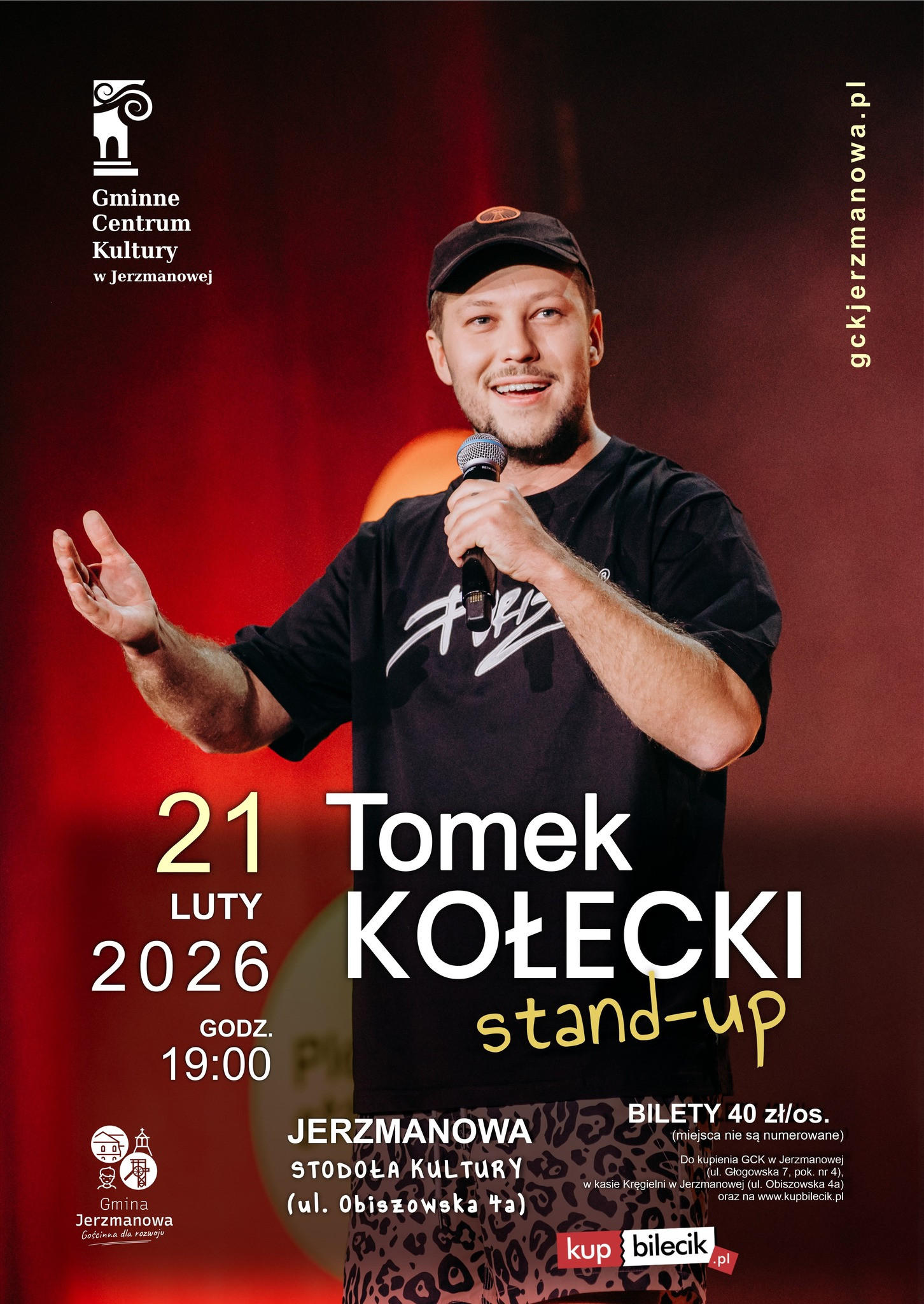 | Miejscowość: Jerzmanowa Miejsce: Stodoła Kultury Data rozpoczęcia: 21.02.2026 19:00:00 Data zakończenia: 21.02.2026 20:00:00 Organizator: Gminne Centrum Kultury w Jerzmanowej Opis wydarzenia: Gminne Centrum Kultury w Jerzmanowej zaprasza na wyjątkowy wieczór z humorem. W sobotę, 21 lutego 2026 roku, o godz. 19:00 w Stodole Kultury w Jerzmanowej wystąpi Tomek Kołecki – stand-uper znany z bezkompromisowych żartów, trafnych obserwacji codzienności i świetnego kontaktu z publicznością. Artysta od lat obecny jest na polskiej scenie stand-upowej, regularnie występując w całym kraju. Jego programy cieszą się dużą popularnością wśród widzów, którzy cenią inteligentny humor, autentyczność i energię występów na żywo. Szczegóły wydarzenia: Data: 21 lutego 2026 r. (sobota) Godzina: 19:00 Miejsce: Stodoła Kultury w Jerzmanowej, ul. Obiszowska 4a Cena biletu: 40 zł/os. (miejsca nienumerowane) Bilety dostępne są: – w GCK w Jerzmanowej (ul. Głogowska 7, pok. nr 4), – w kasie Kręgielni w Jerzmanowej, – online na stronie kupbilecik.pl. Serdecznie zapraszamy wszystkich miłośników dobrego humoru! |