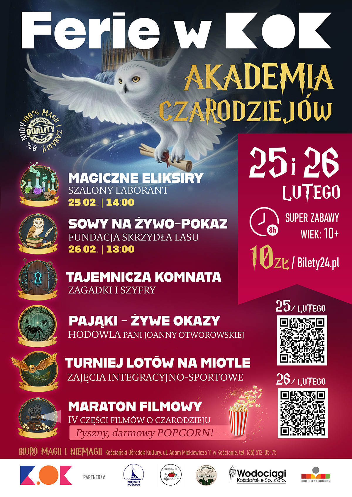 | Miejscowość: Kościan Miejsce: Kościański Ośrodek Kultury Data rozpoczęcia: 25.02.2026 14:00:00 Data zakończenia: 26.02.2026 21:40:00 Organizator: Kościański Ośrodek Kultury Opis wydarzenia: Szukasz pomysłu na ferie, które naprawdę wciągną Twoje dziecko? Takie, które oderwą od ekranu i przeniosą w świat przygody, tajemnic i wspólnej zabawy? Kościański Ośrodek Kultury zamieni się w magiczną przestrzeń inspirowaną światem Harry Potter. Przez dwa dni młodzi uczestnicy wezmą udział w niezwykłej wyprawie pełnej filmowych emocji, eksperymentów rodem z lekcji eliksirów, ruchowych wyzwań, zagadek i spotkań z fascynującymi zwierzętami. To połączenie kina, nauki i aktywnej zabawy w bezpiecznej, sprawdzonej przestrzeni – z nutą magii i dużą dawką dobrej energii. DZIEŃ I – 25 lutego (środa) | 14:00–21:40 Wiek: od 10 lat 14:00 – Magiczne eliksiry (pokaz eksperymentów) Seans filmowy – część I Turniej Lotów na Miotle Seans filmowy – część II 21:40 – Zakończenie dnia DZIEŃ II – 26 lutego (czwartek) | 13:00–21:40 Wiek: od 12 lat 13:00 – Spotkanie z sową (Fundacja Skrzydła Lasu) Seans filmowy – część III Turniej Lotów na Miotle Seans filmowy – część IV 21:40 – Zakończenie dnia BILETY NA KAŻDY DZIEŃ SPRZEDAWANE OSOBNO!!! I DZIEŃ (środa) | 25 lutego : https://kok-koscian.bilety24.pl/wydarzenie/?id=147984 II DZIEŃ (czwartek) | 26 lutego : https://kok-koscian.bilety24.pl/wydarzenie/?id=147986 |